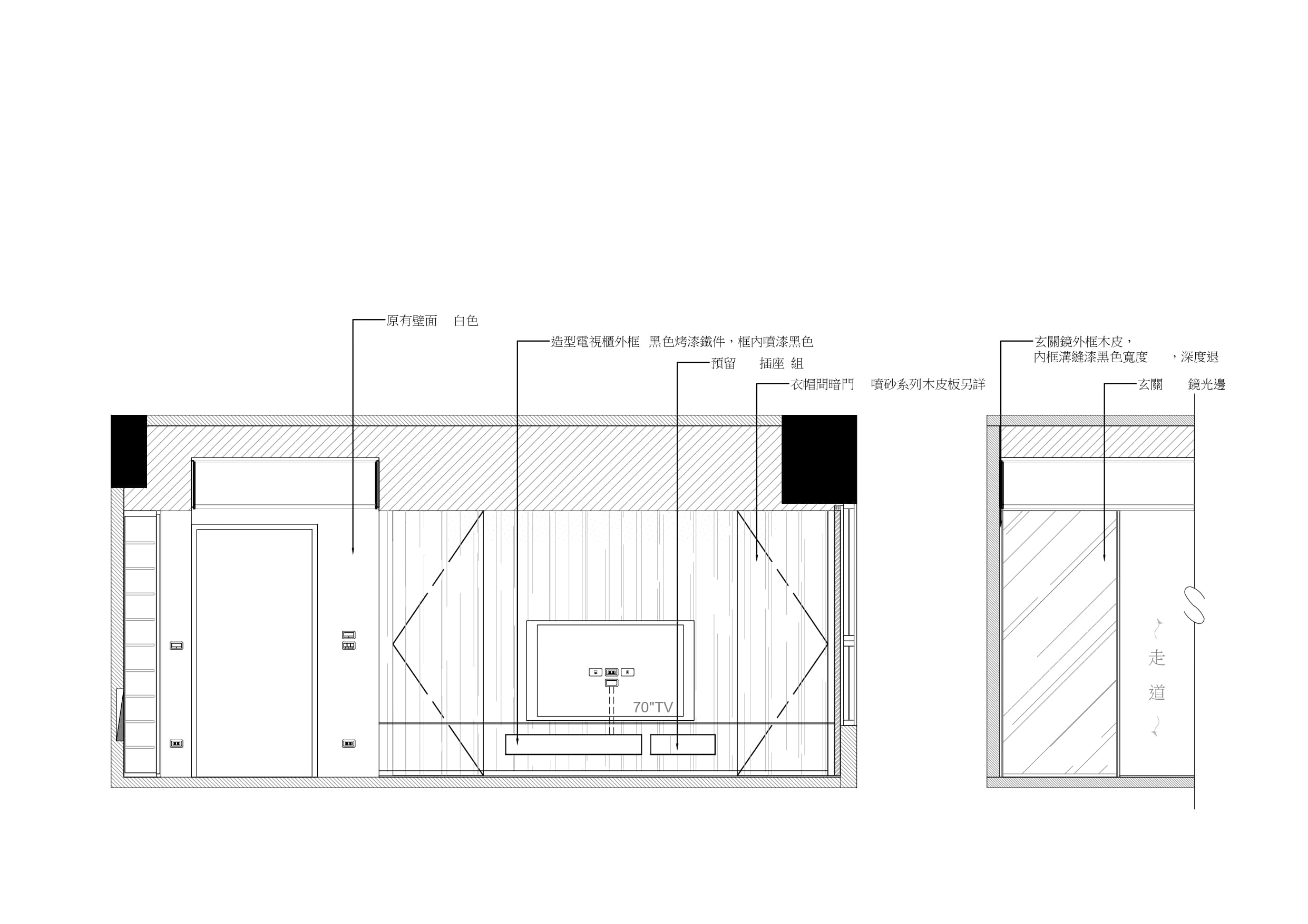 ③ 梧桐木紋電視主牆,隱藏2間房門。