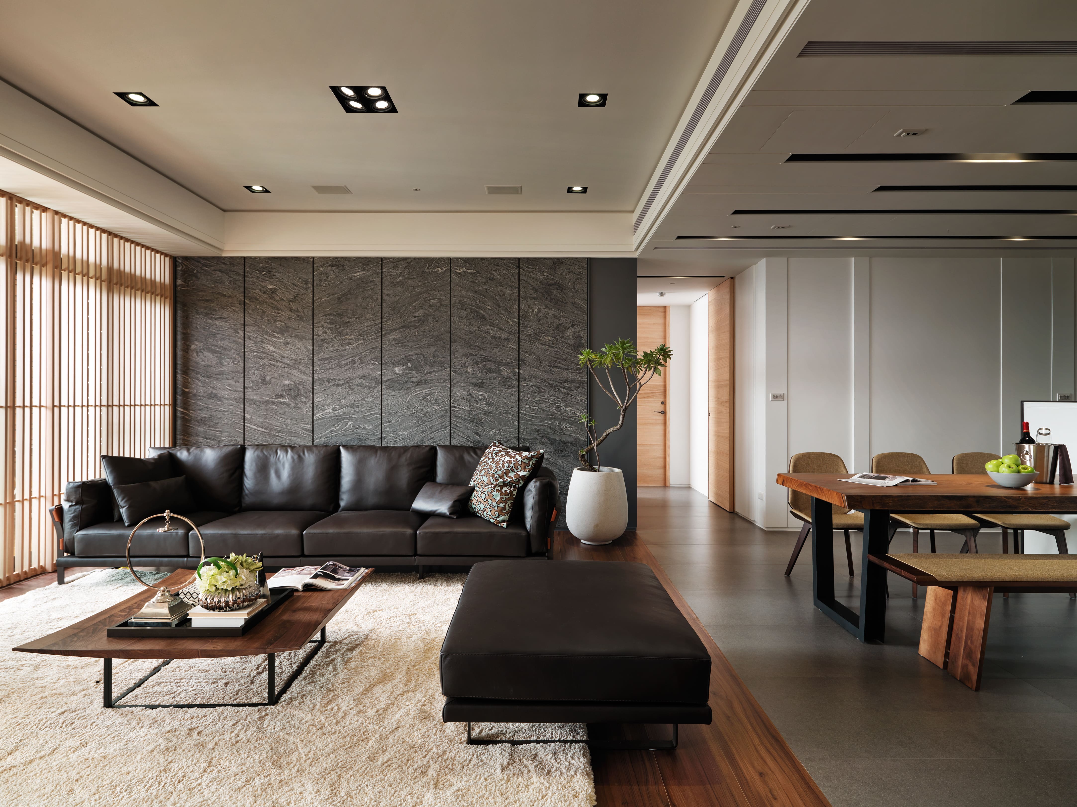 雙主牆,是本案的新觀點,對應格柵木質玄關牆的視線後方,沙發背牆採大片原石切割,石材天然紋理的行雲流水感,與前方玄關的原味木色,利用前後景深,組構一幅立體潑墨山水畫意境。與沙發背牆相對望的電視主牆,則身負隱藏左右兩側出入門重任,因此在整道梧桐鋼刷木皮上,以不等分直線切割融入門片溝縫,內凹機電櫃則讓公領域動線與視覺更為平整順暢,不用刻意裝飾,大尺度線條鋪滿罄道立面就能保有空間的清爽與展延。