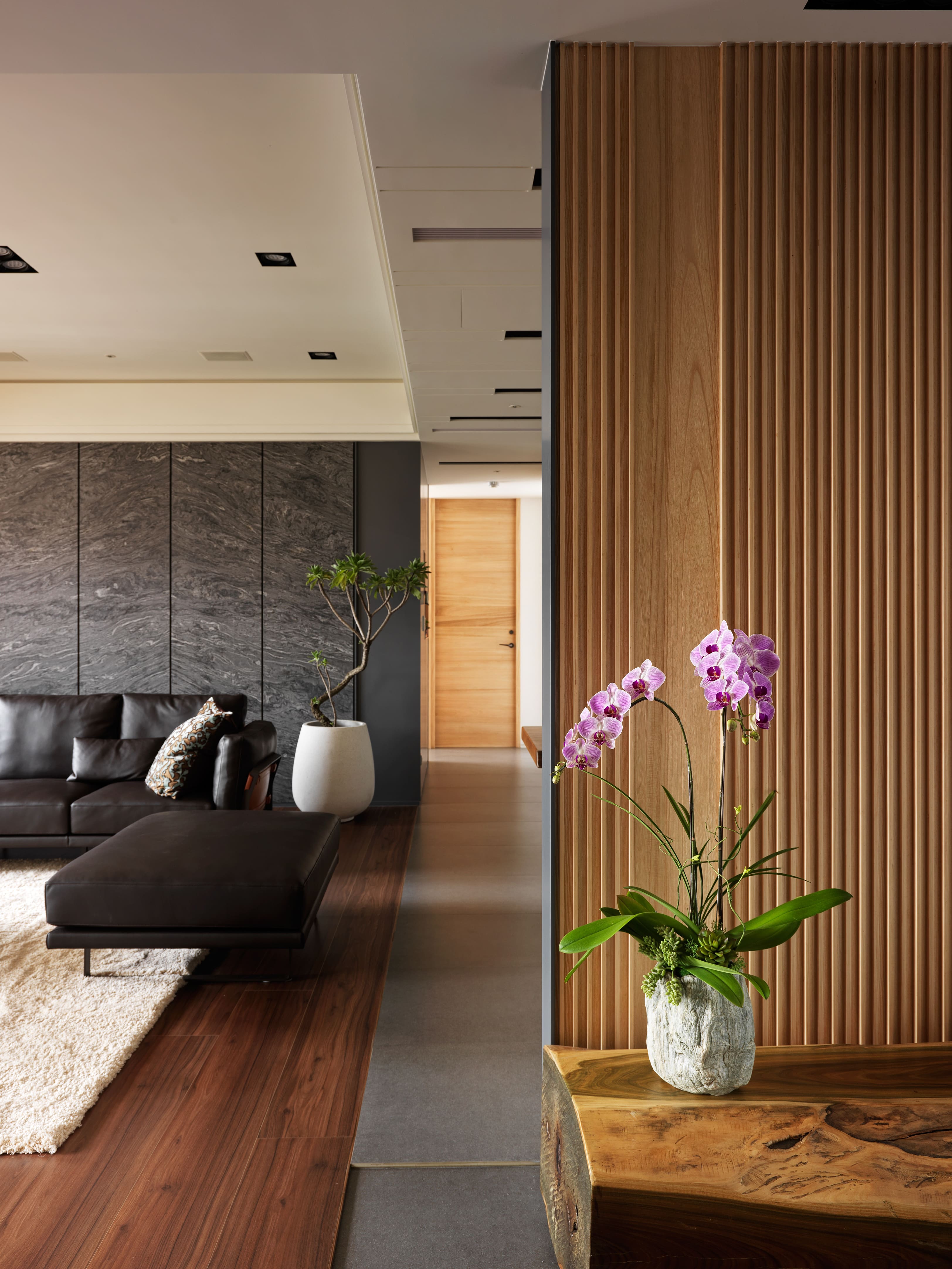 原無玄關的本案,為製造入門緩衝與保留隱私,在入口與餐廳動線之中,由天花板降下一道落地梧桐木格柵端景,加上前方一塊原木底座,不僅構築一道猶有韻味玄關端景牆設計,更巧妙成為視線後方那道有如山水畫石材沙發背牆的前景,一深一淺、一木頭一石材的前後對比與呼應。