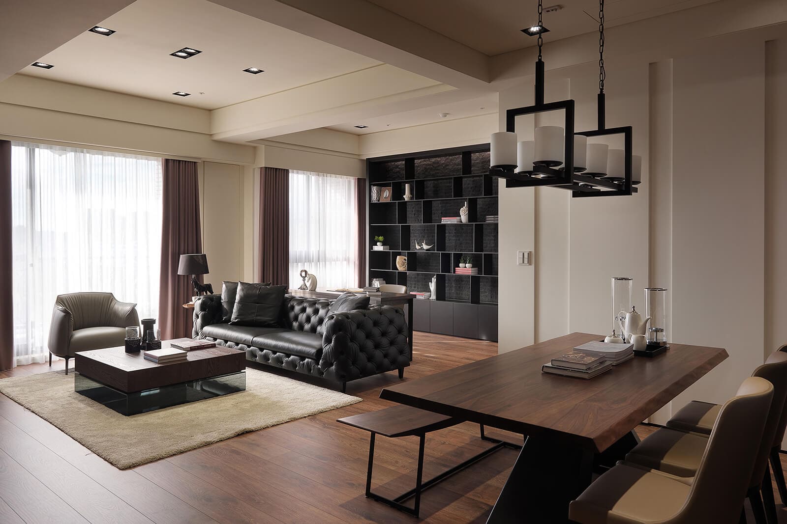客廳的電視主牆,創作出一幅石與木、鐵的視覺藝術;以大理石水沖面的部份作為電視底牆;下方以鐵件與木作打造ㄇ型基座,顯見俐落;再由梧桐木接續石材演繹,以隱藏門手法納入孝親房,延續至格柵,讓木質橫直紋也整合出一路伸展的活潑視覺。此外,皮革釘扣沙發與經典單椅搭配,點睛古典與現代的個性品味。沙發後方規劃為閱讀區,其中書櫃牆重現韓劇場景元素,由於屋主喜愛韓劇中都教授的臥室主牆材質黑色粗獷板岩,但是設計師認為床頭大面積使用此材質,空間感會偏冷冽,因此提議將石材轉用在書櫃背景牆,前景以鐵件組合成書櫃,燈光輝映中再次展現混搭美學。