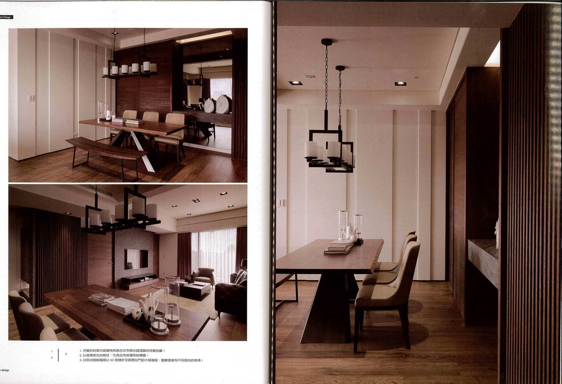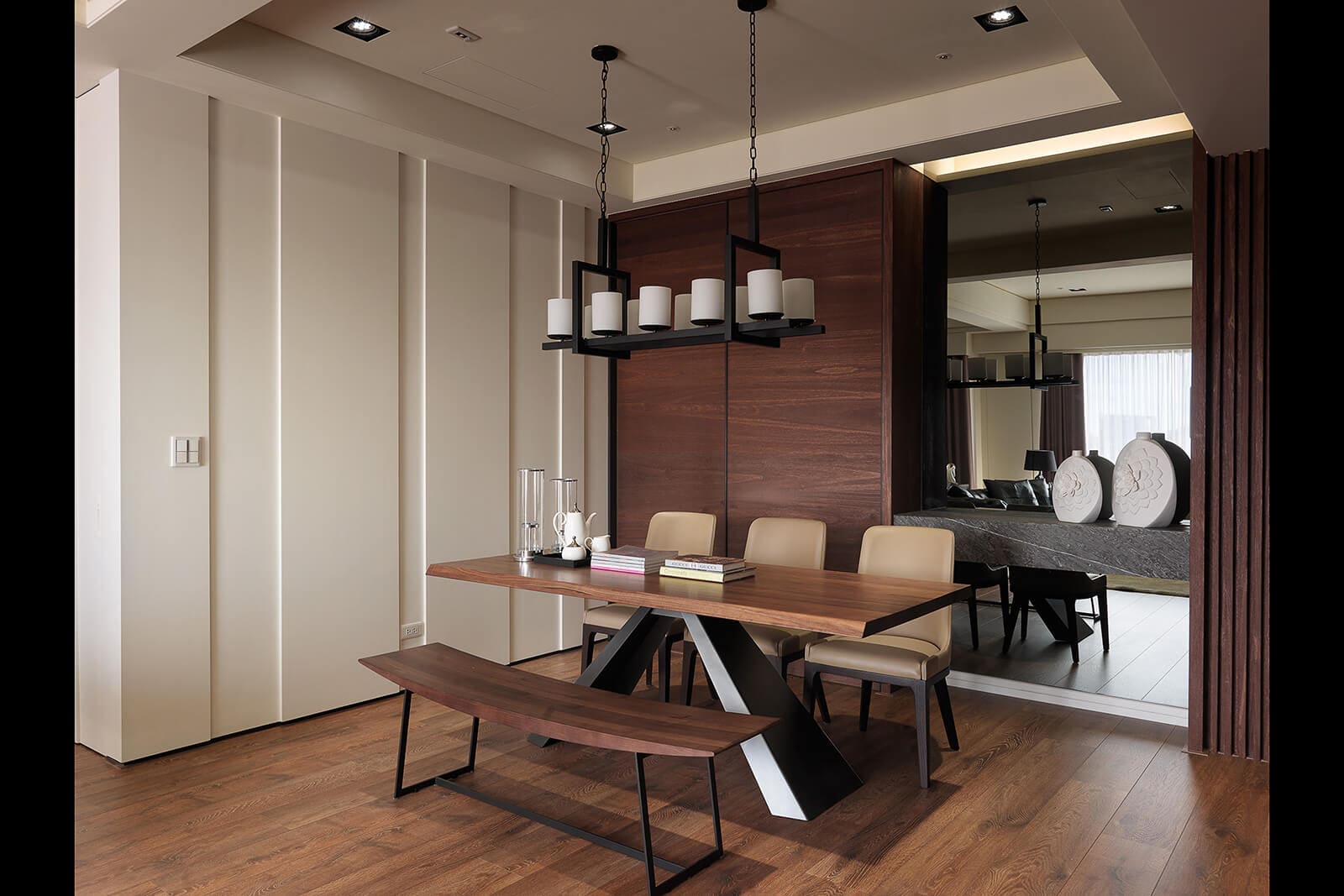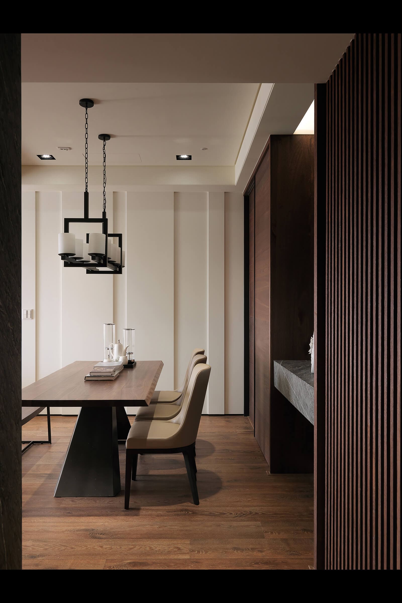 In the dining area, the modern dining chairs with curved retro-style chandeliers combined spectrum cozy dining atmosphere. The white walls cut lines at 90 degrees turn to the kitchen sliding wooden walls, let the dining area with different oriented expression. Next to the wooden door is a gray concave mirror and stone countertops, forming side view, connecting to the grid beautify beams, becoming angles and effective use of the structure.