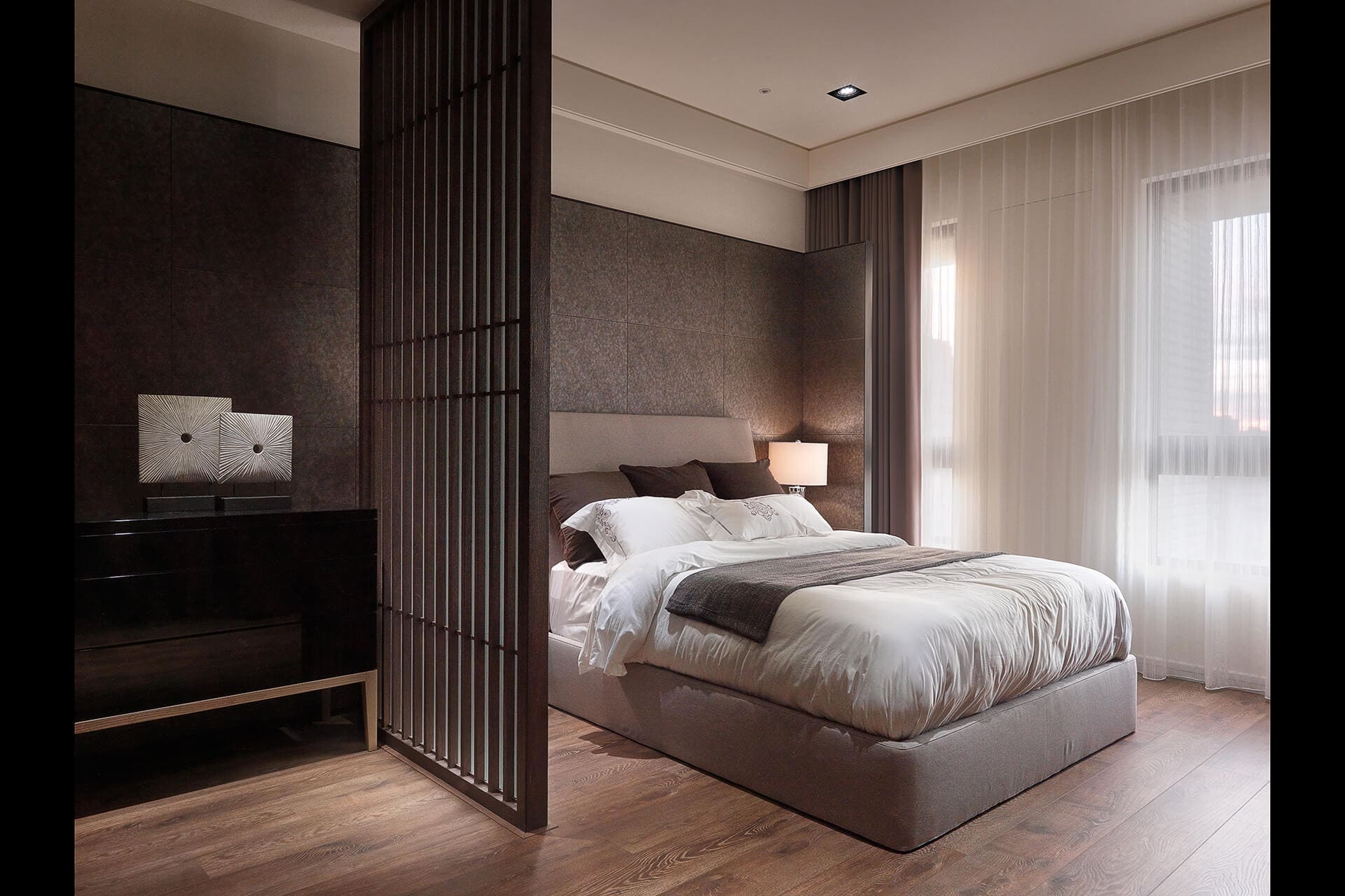 屋主將主臥室留給偶然暫住的父母親,床座和浴室之間訂製格柵屏風化解風水禁忌,也成為一道風景;屏風不靠牆,為讓床頭精緻的皮革質感能橫跨至黑色鋼烤斗櫃,使視覺美感不受切割;床頭微轉折,營造出安穩的舒眠環境;衣櫃納入電視,立面平整,呈現安定的溫潤質感。