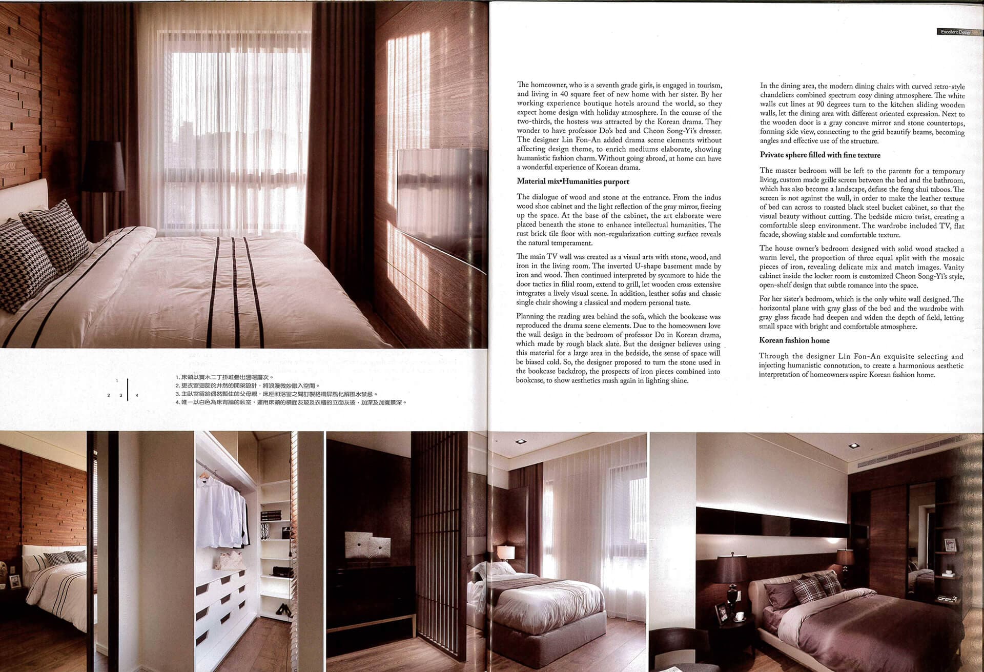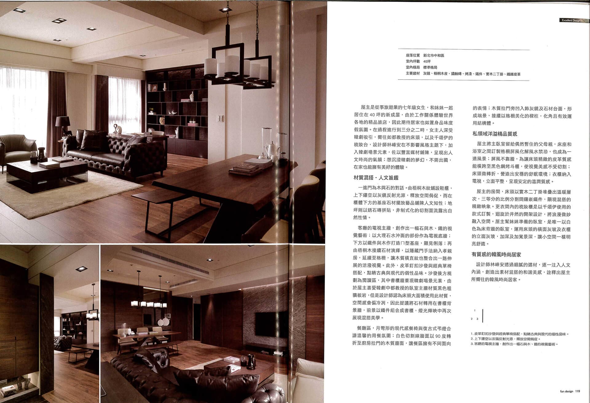 屋主是從事旅遊業的七年級女生,和妹妹一起居住在40坪的新成屋,由於工作關係體驗世界各地的精品旅店,因此期待居家也如置身品味度假氛圍。在過程進行到三分之二時,女主人深受韓劇吸引,嚮往如都教授的床頭,以及千頌伊的梳妝台,設計師林峰安在不影響風格主題下,加入韓劇場景元素,佐以豐富媒材鋪陳,呈現出人文時尚的氣韻;想沉浸韓劇的夢幻,不需出國,在家也能擁有美好的體驗。