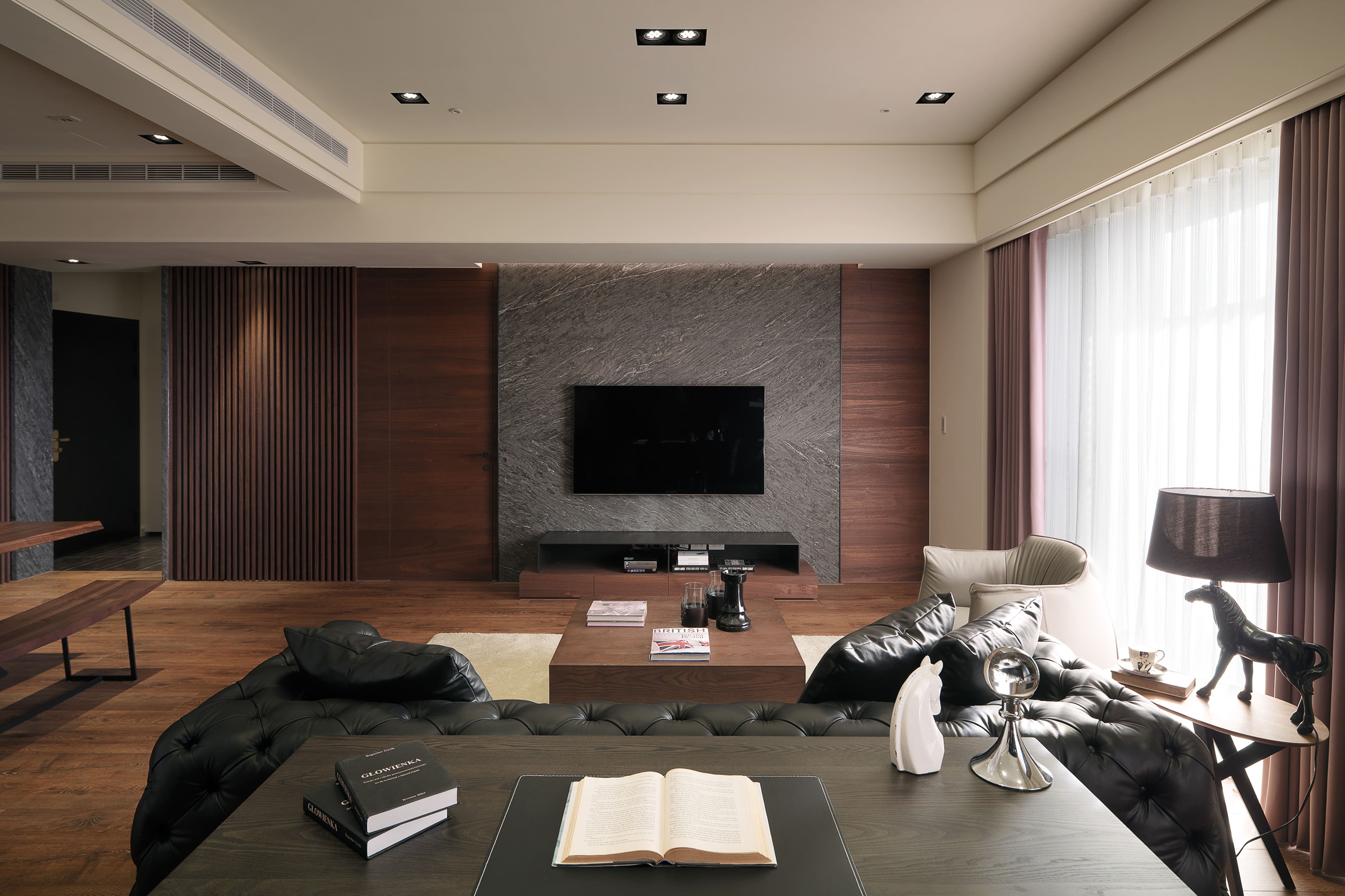 ① 電視主牆結合木格柵、梧桐木、石材三種材質。