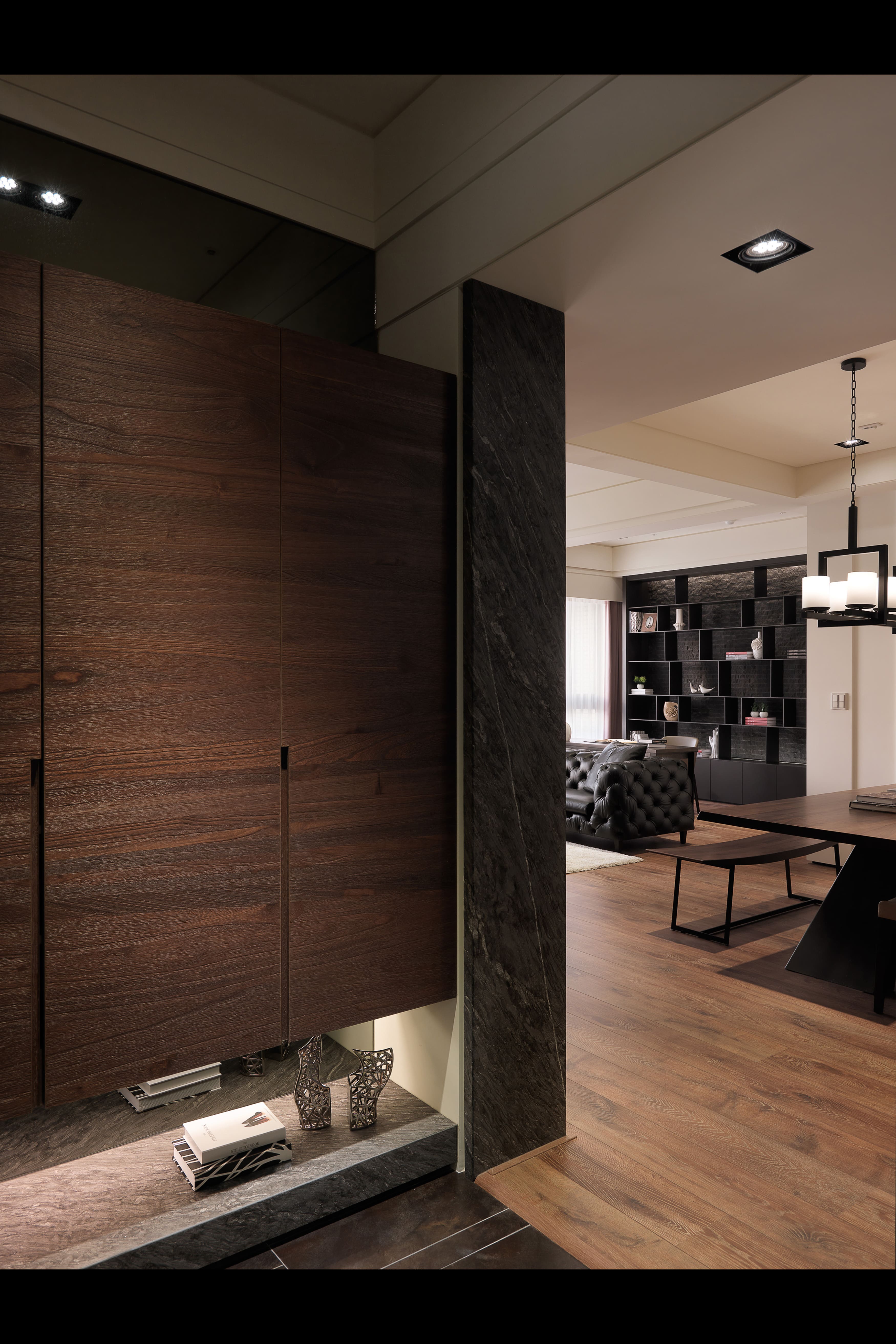 電視主牆不一定是獨立存在,運用與其他壁櫃面呼應連結的材質、色系,會讓空間更為統一、協調,看起來更具完整性、更精緻。本案從玄關即以梧桐木懸吊鞋櫃搭配石材元素,延伸轉彎到整道電視主牆,再結合隱藏門的設計,讓電視主牆視覺不但得以延伸,感覺更為大器之外,更兼具實用機能。 從玄關轉彎延伸至電視牆最左端壁面,先以木格柵隱藏鞋櫃與收納櫃,接著運用梧桐木裝飾於電視石材主牆的兩側,其中一道還隱藏著主臥房門;置中的消光面灰階石材以鐵件收邊包框,上緣並融入天花線板,達到輕化石材目的。而與電視主牆相對望的沙發背牆,即是開放式書房櫃牆,黑色鐵件層架與黑色鑿面石磚背牆,得以與電視主牆材質與色系相呼應。