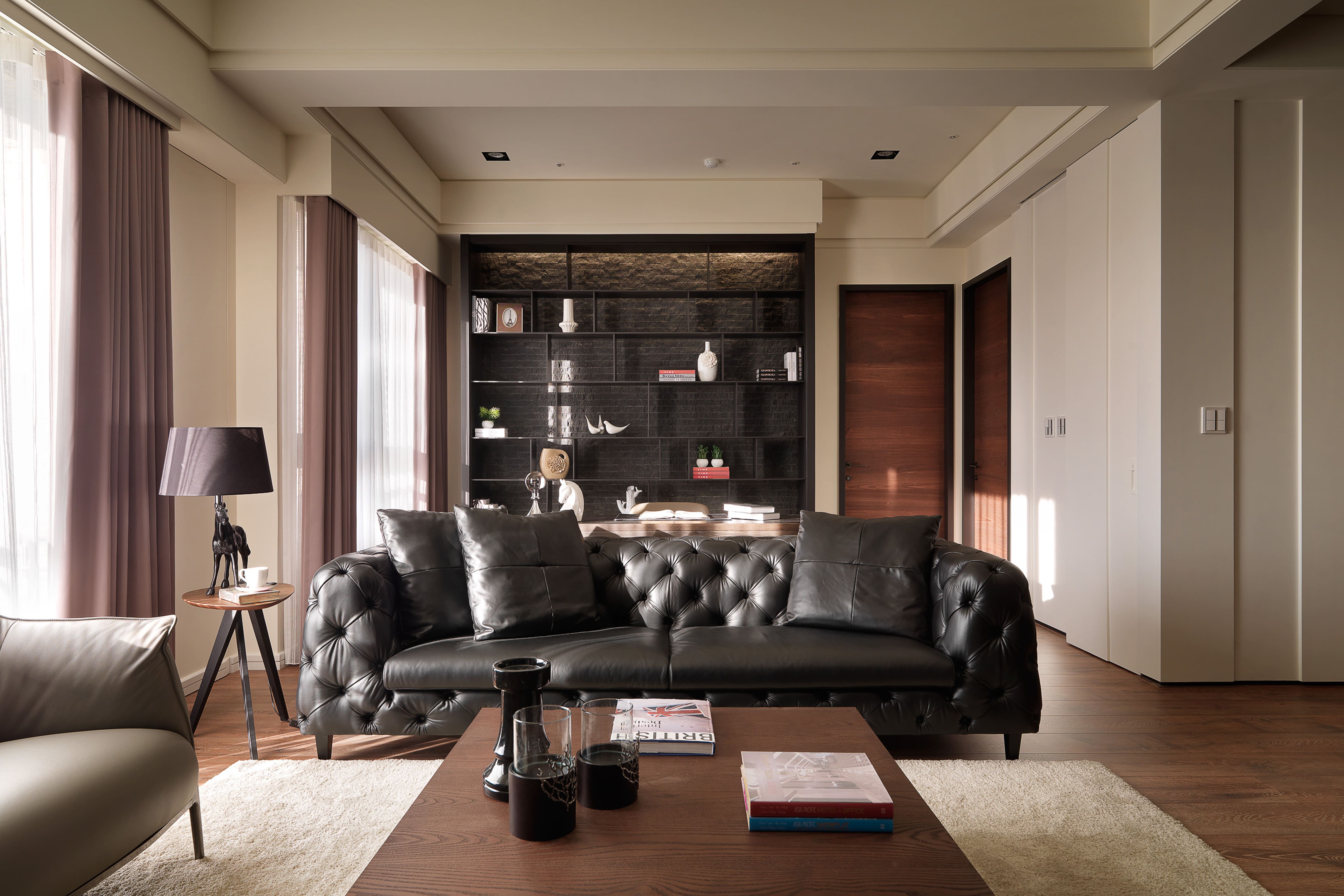 ③ 沙發背牆書櫃,以黑色鐵件層板與黑色鑿面石磚打造。