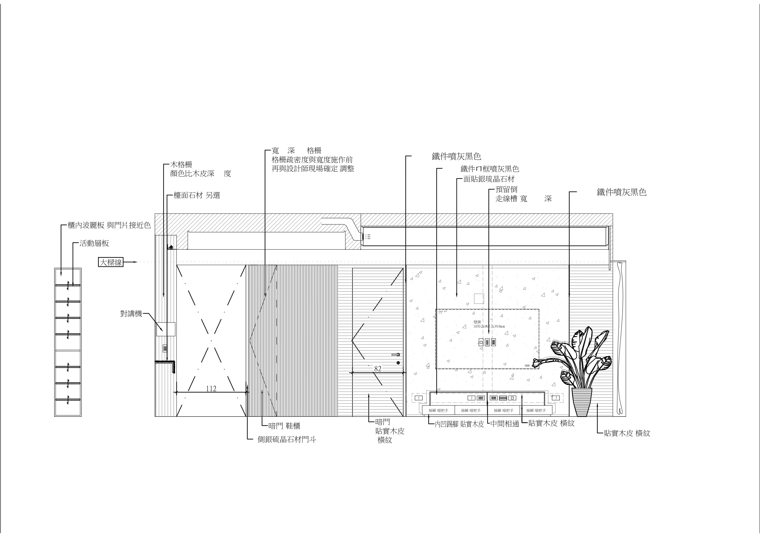 玄關懸吊鞋櫃以梧桐木配搭石材,並將此兩種材質延伸轉彎到電視主牆。