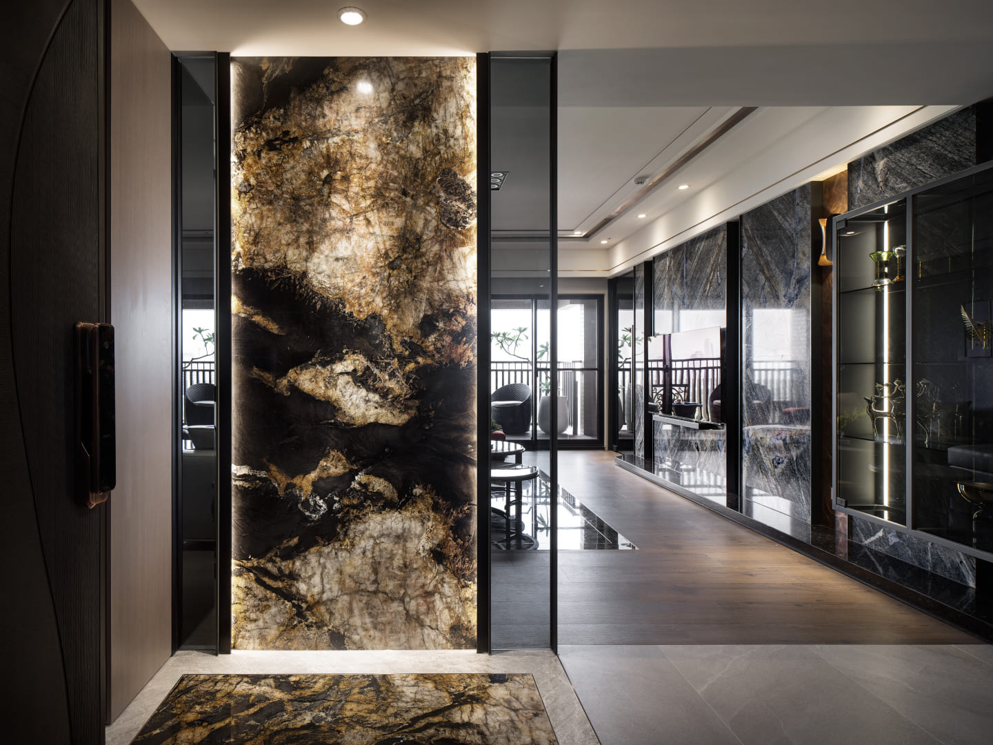 從玄關進來,以鍍鈦、鐵件,以及猶如北宋山水畫大器的萬寶龍石材,打造時尚奢華的現代風格。石材從壁面延伸到地板,同樣以藝術創作的實與虛概念,鐵件在左右兩側與石材搭接,再以半透光的灰玻璃,猶抱琵琶半遮面地與客廳區隔,兩者之間,互通聲息,又能成為轉換心情的過渡空間。