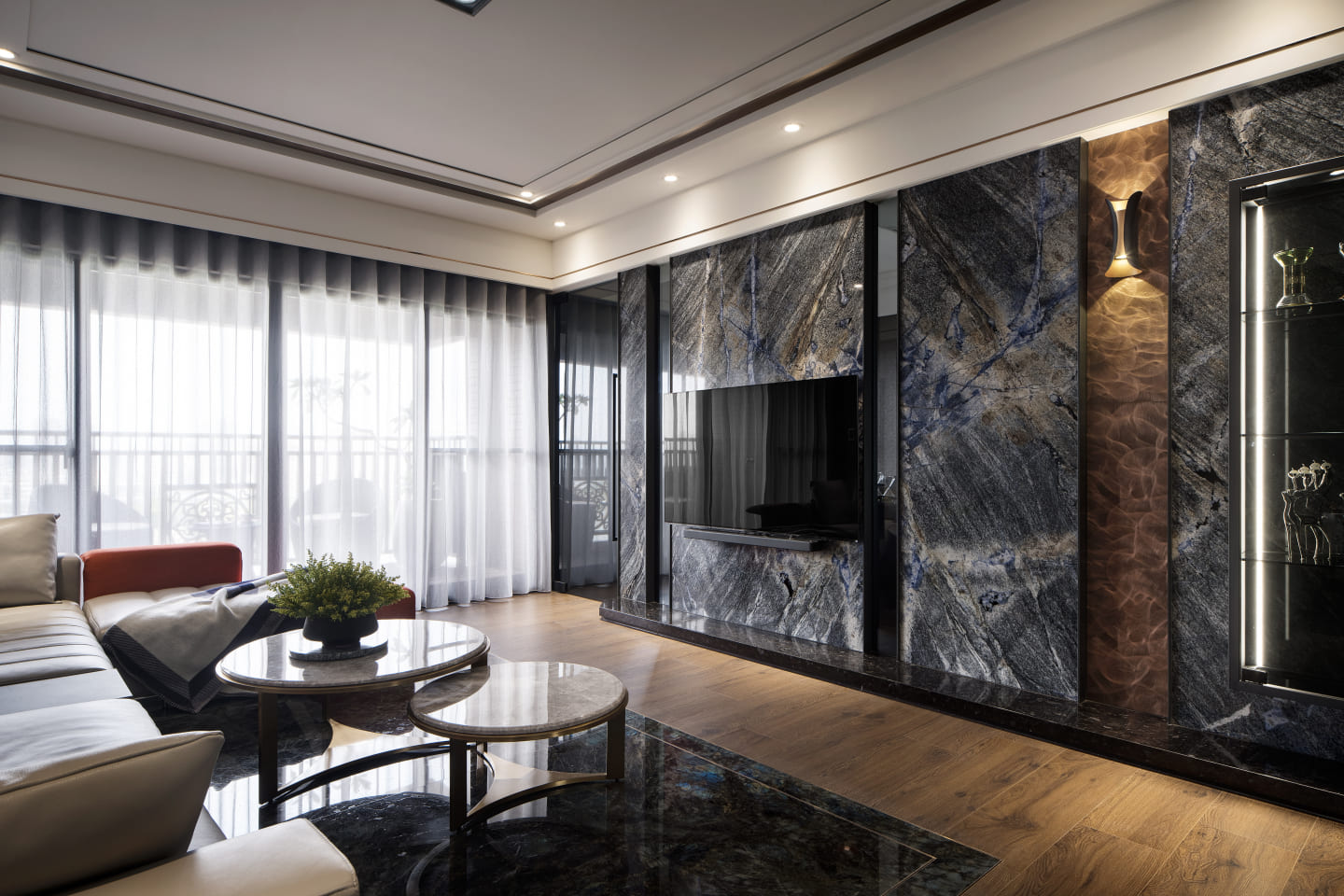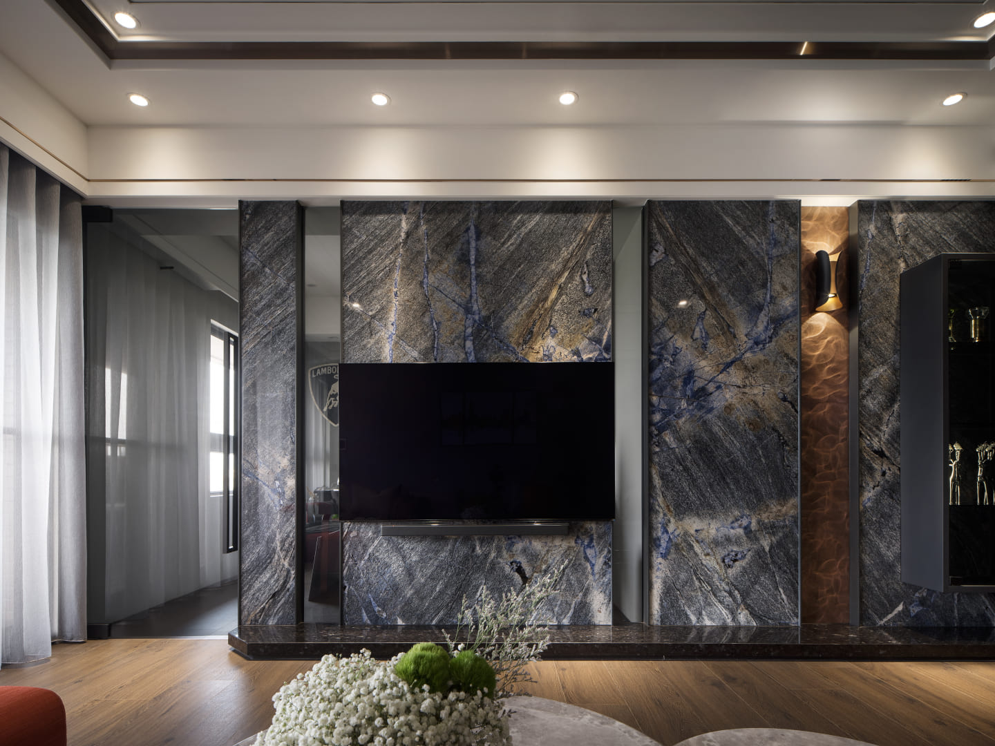 黑武士石材於電視牆面,巧妙分割呈現不同質感。