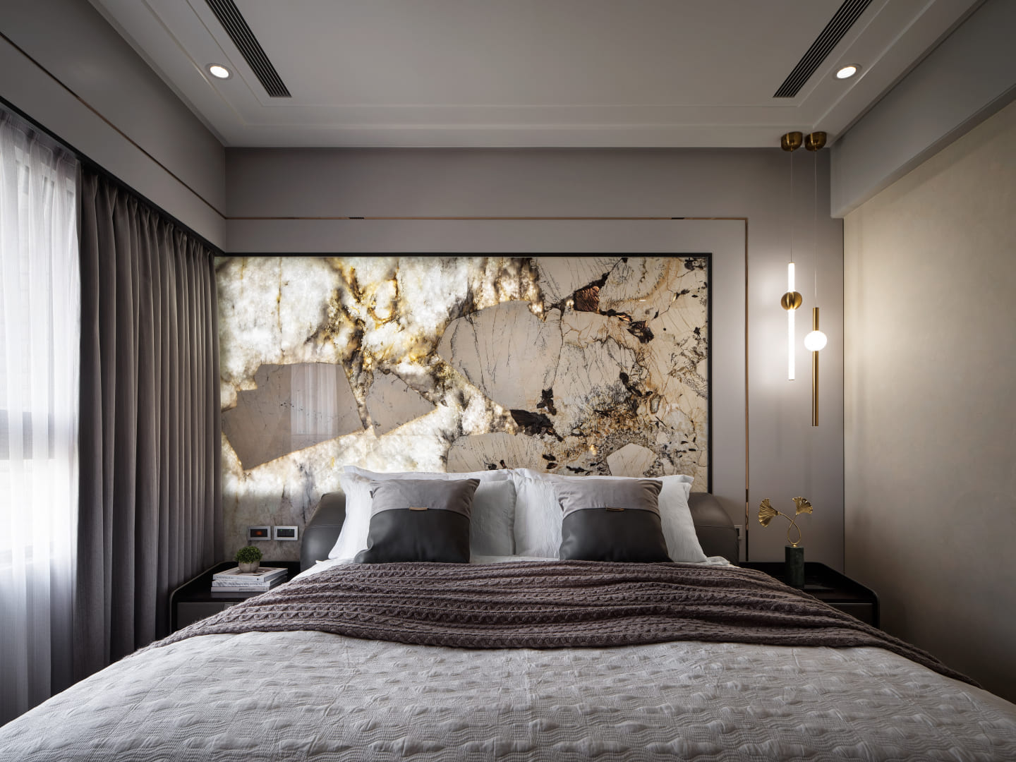 A:石材是上帝創造出的藝術品,設計師只是將它融入空間,思考如何呈現它的質和美,襯托出石材的美感。透過引入自然光,可以呈現大理石的質地和紋理,或從後方、上方打光,讓石材在天壁地不同的空間,隨著時間變化,相乘出不一樣的面貌。石材屬於耐磨材質,但設置在對的地方才會增加其耐用程度。像是毛細孔較粗、容易吃色的大理石,就不適合施作於浴室及檯面。若是地面,則要選擇硬質、耐磨係數高的花崗岩,再經由資深師傅巧手切割安裝,呈現出這片石材最美的那一面。