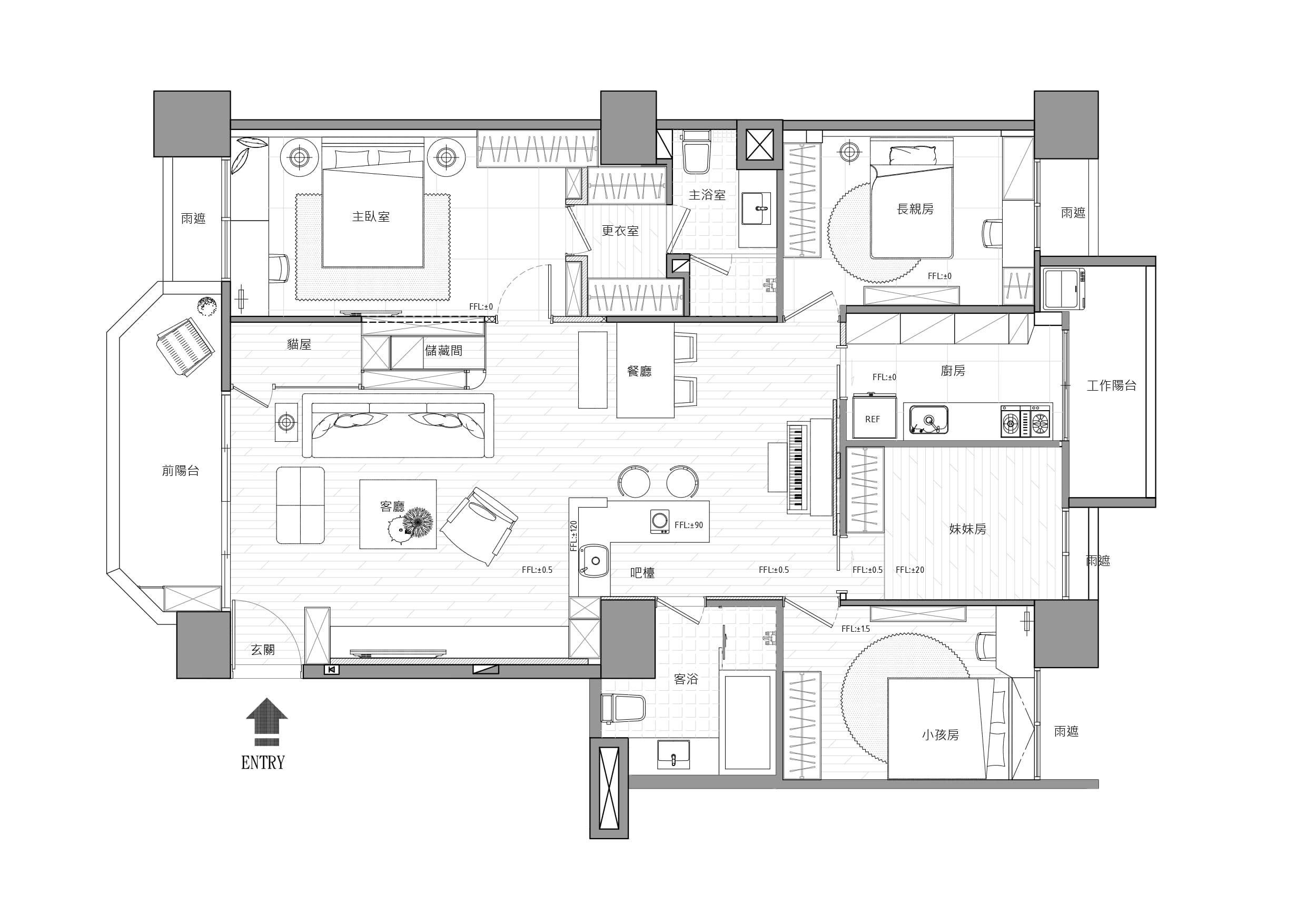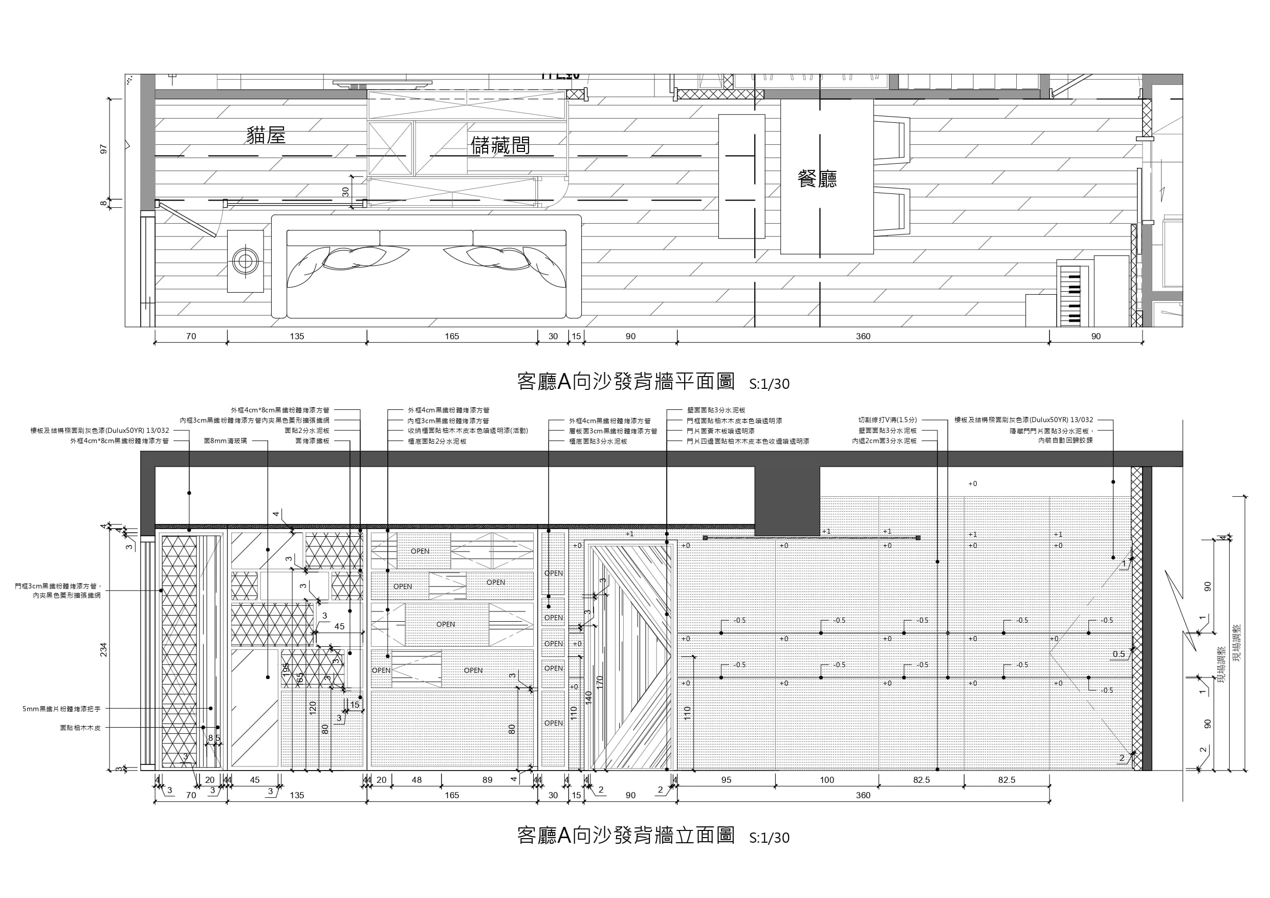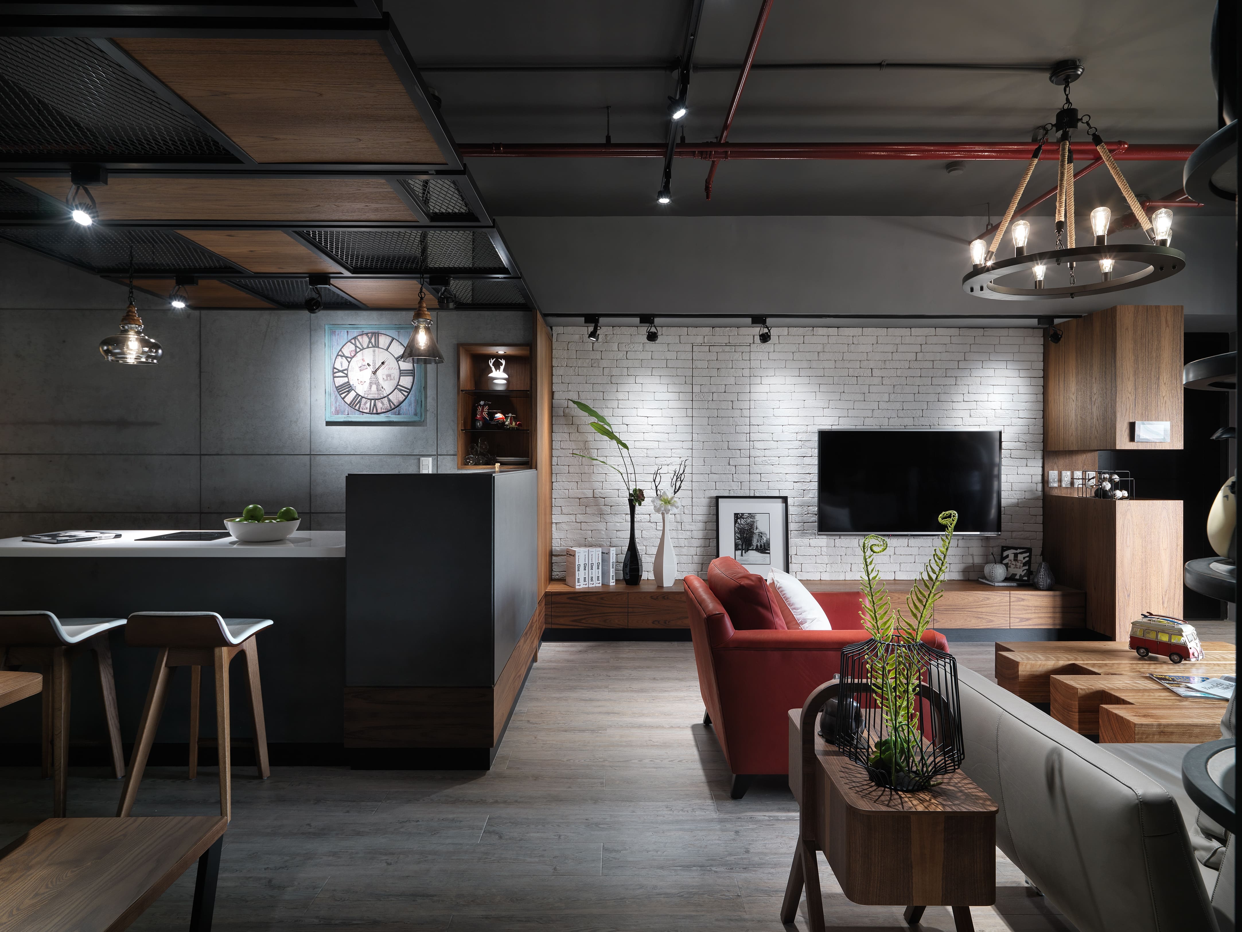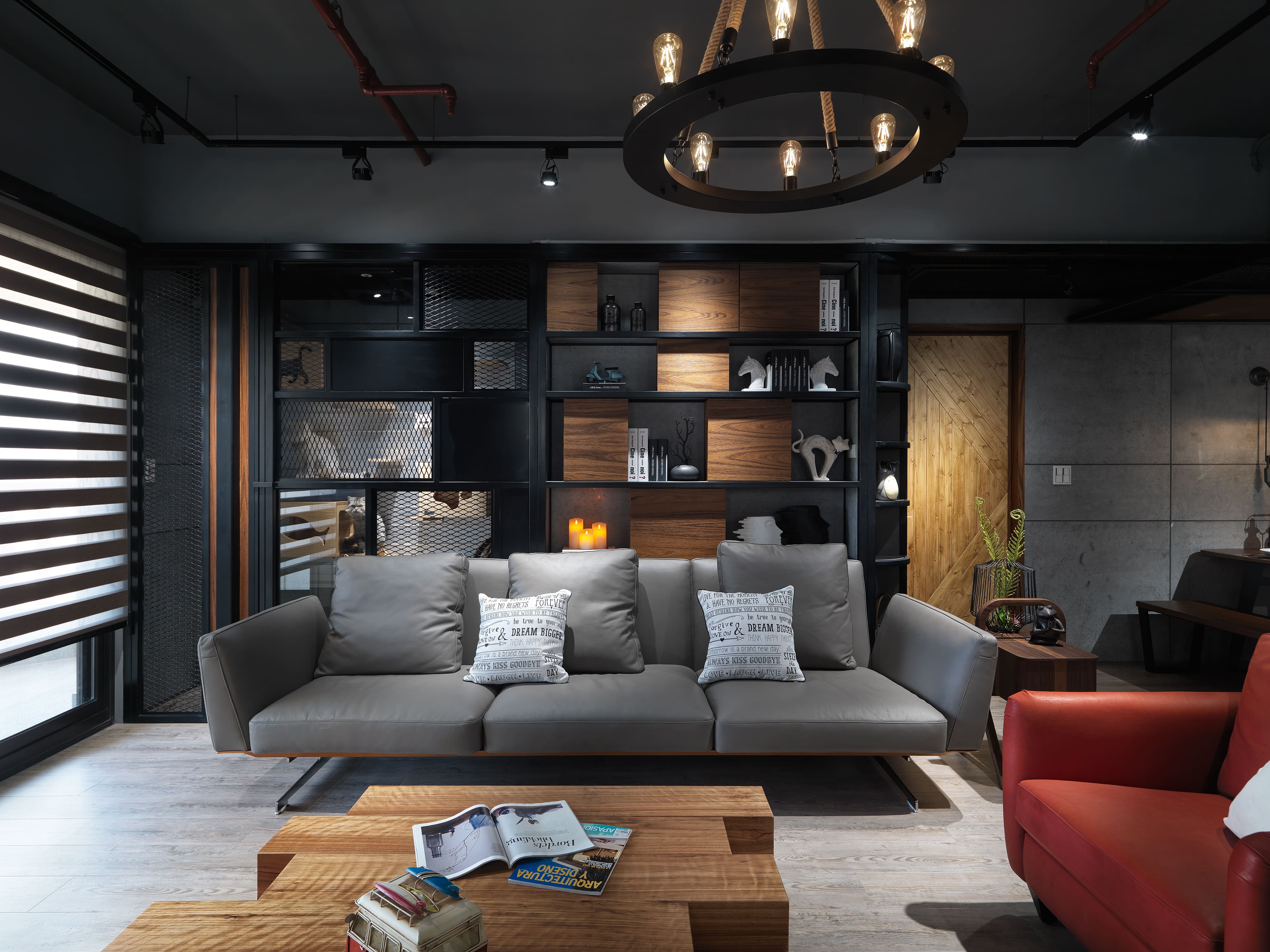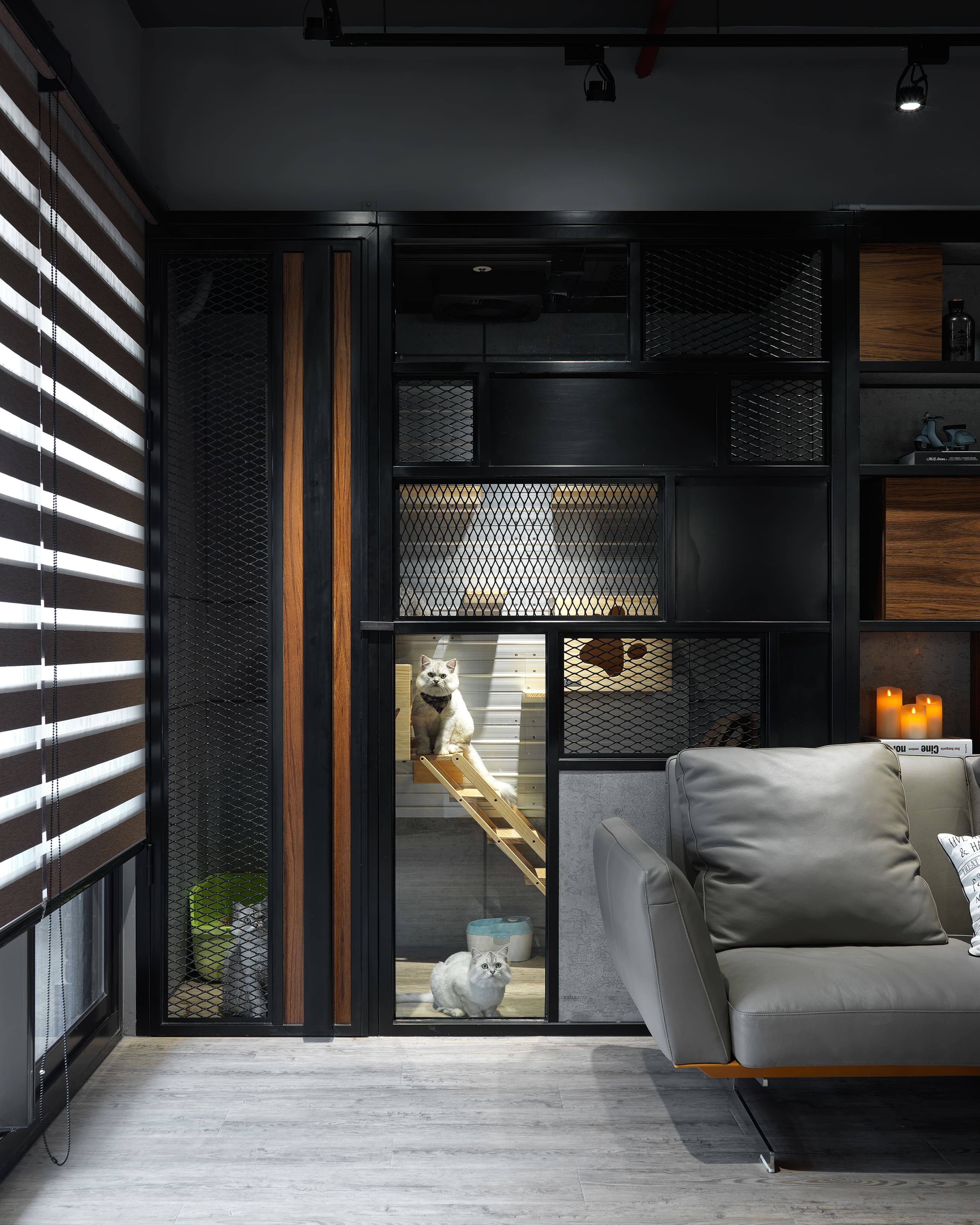 對屋主而言,打造4隻愛貓的專屬遊樂天地,遠此看電視重要得太多了,跳脫一般電視主牆的定位,將主牆定義在沙發背牆,運用沙發後方樑下超過三米面寬的靠牆空間,一分為二,左半部以菱形鐵網、水泥板、深黑鐵件規劃成「貓屋區」,分別留有主人與貓小孩出入口,區內層板為活動式,隨時調整貓兒們跳躍輕走路線。右半部分為前後兩層,前區為公仔陳列開放櫃架,黑鐵層板中錯落著一格格木櫃,活動式設計能依展示物件的尺寸調整間距,也增加背牆視覺趣味;後區則隱藏儲藏室,將開放層架至儲藏室入口轉角修圓收邊,弧形立面亦為陳列架。這道立體空間的沙發背牆,完美建構屋主為愛貓打造悠遊空間的需求,巧妙化解大樑於無形,更聚焦本案精彩創意濃縮,才是空間的主視覺。