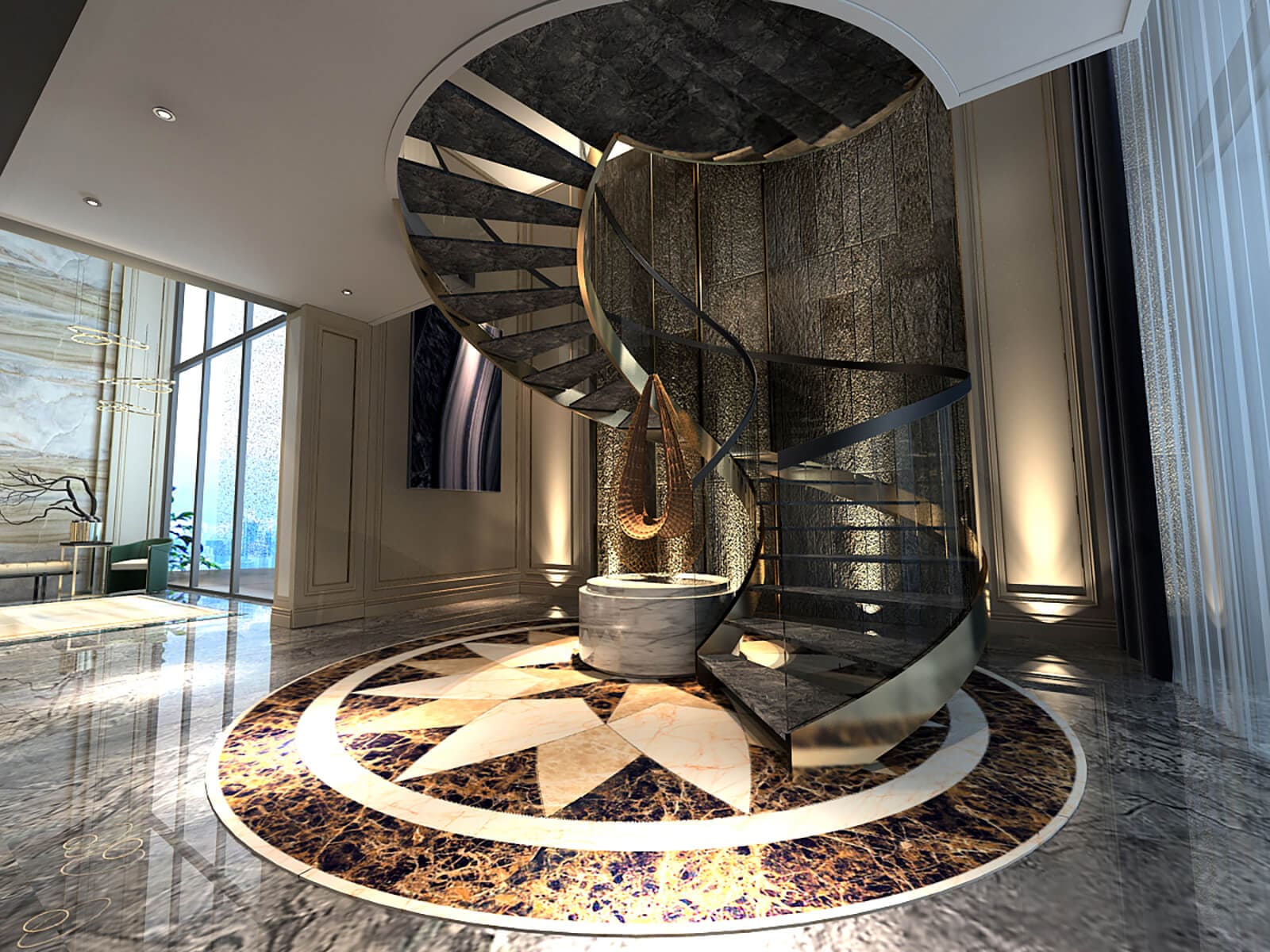 spiral staircase connecting the floors is made of metallic