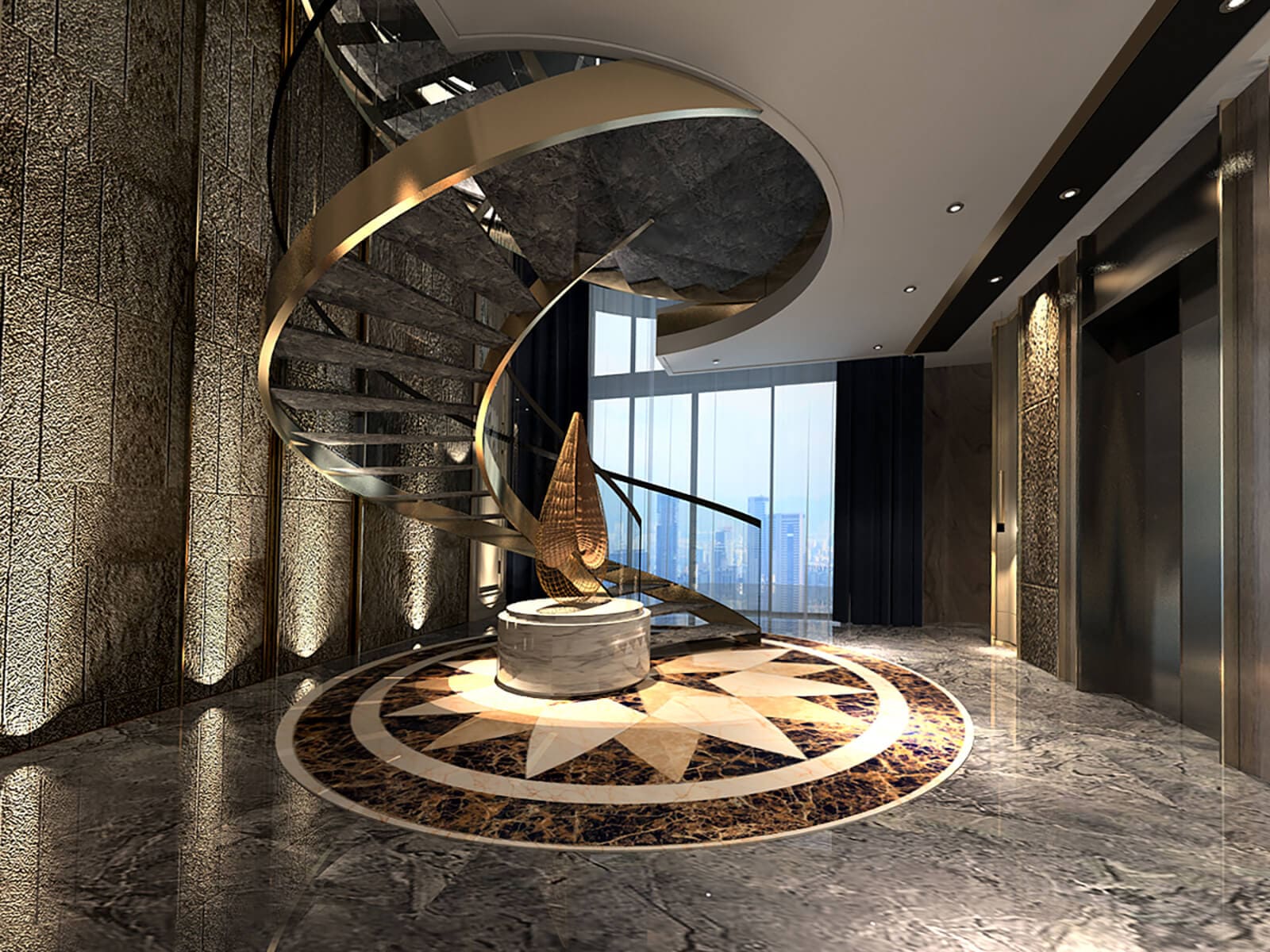 courtyard, while the entrance foyer, adorned with metal