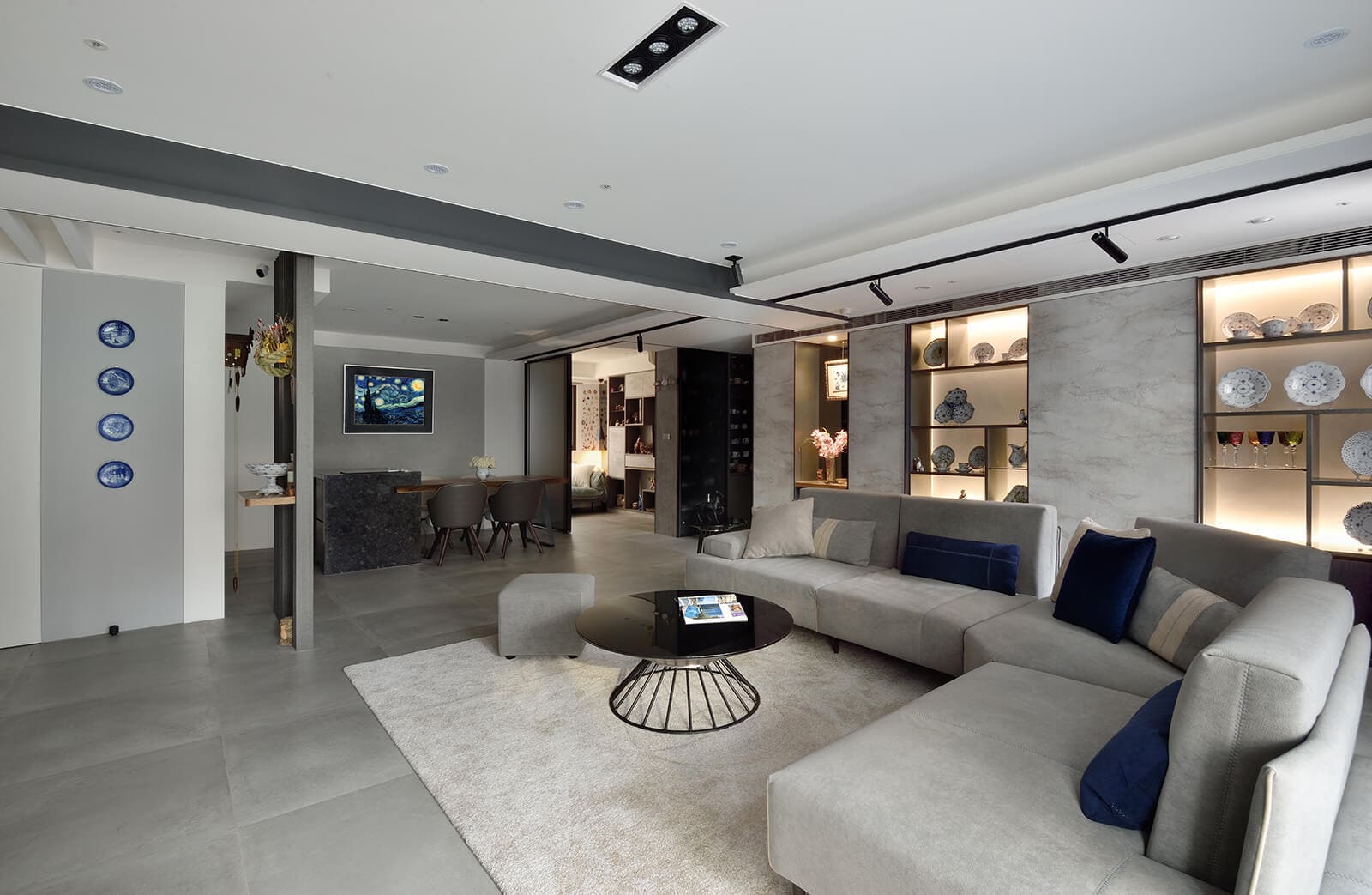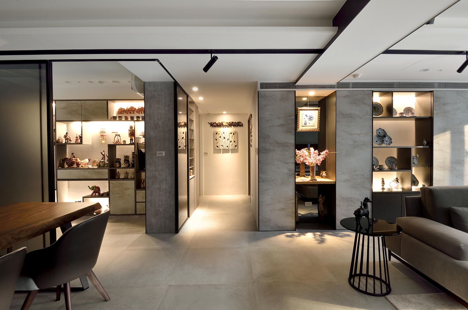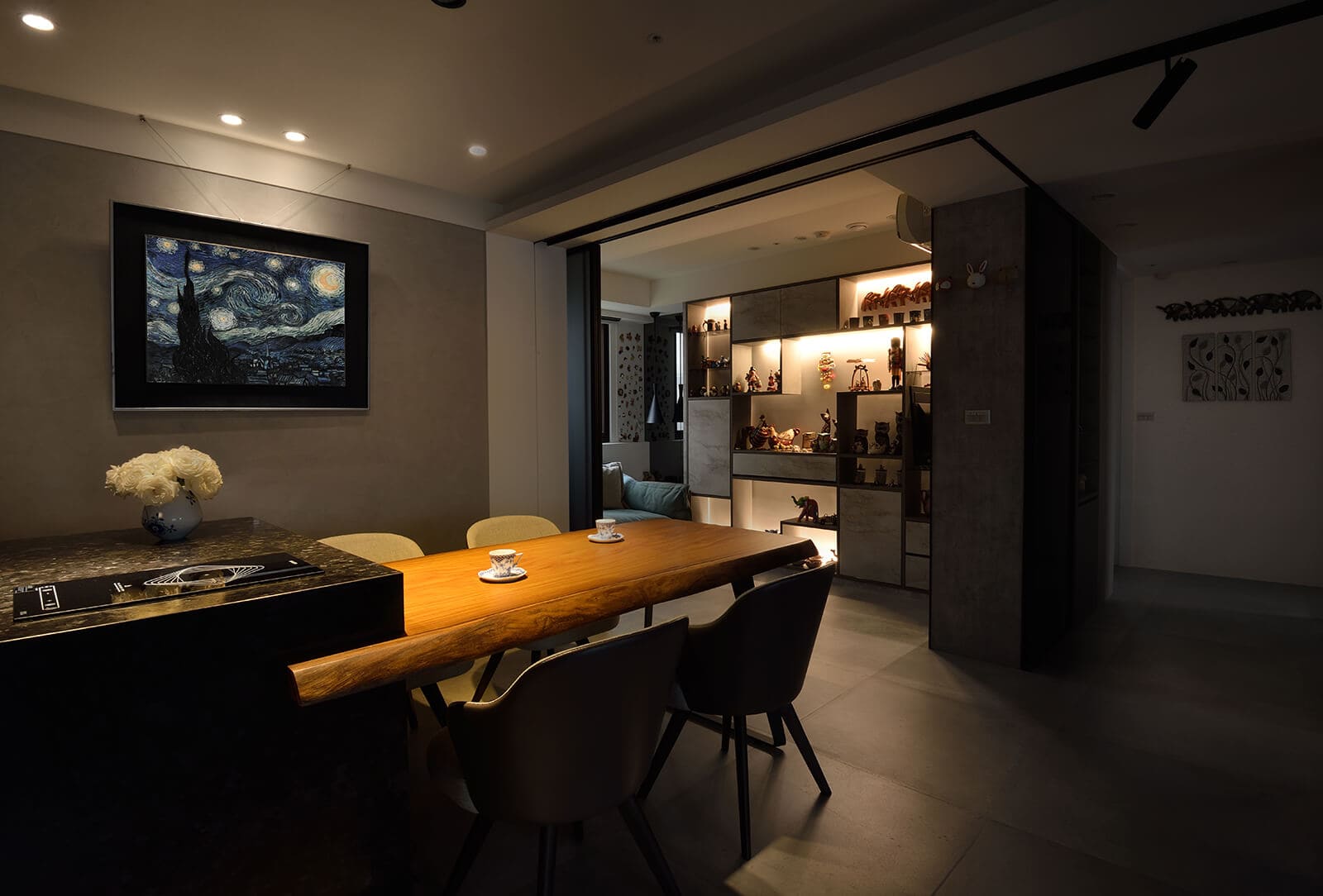 全室以灰階為地與壁的顏色,低調涵納眾多收藏品豐富而精緻的表情,件件瓷器,如段段甜蜜記憶,襯著層層光影無聲無息地翻寫記載,進入心底。