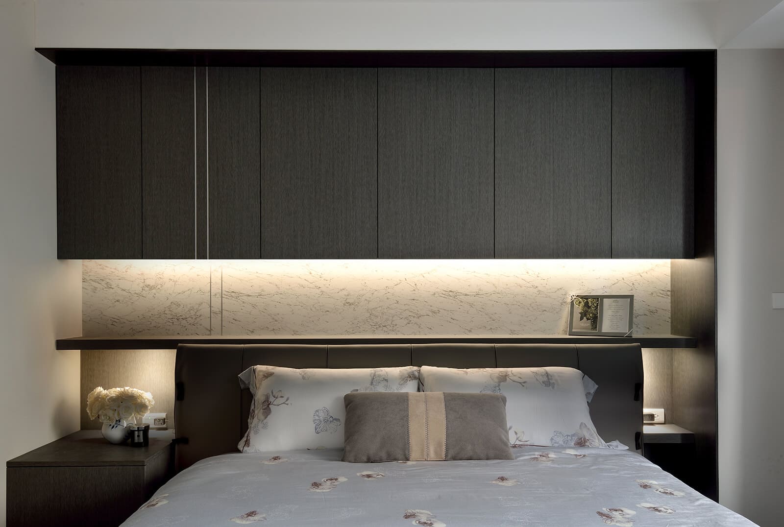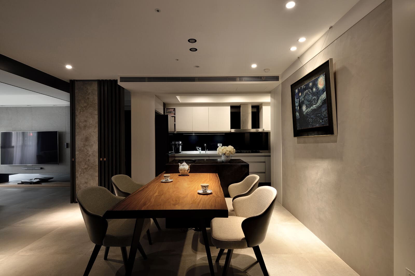 透過點線面的延伸,運用單純材料、間接光氛構組空間的比例,含蓄而內斂地表達出前後景身、虛實輕重的對比關係,確保足夠的留白與主題元素彼此應和,讓空間回歸生活、回歸純粹。
