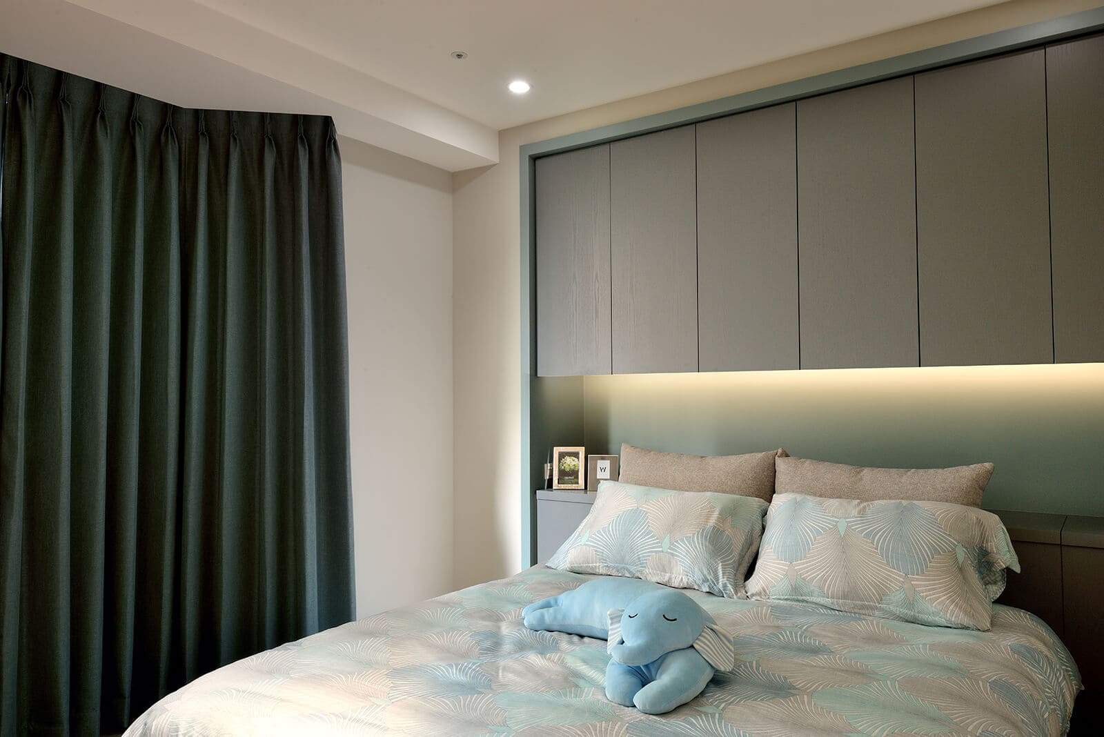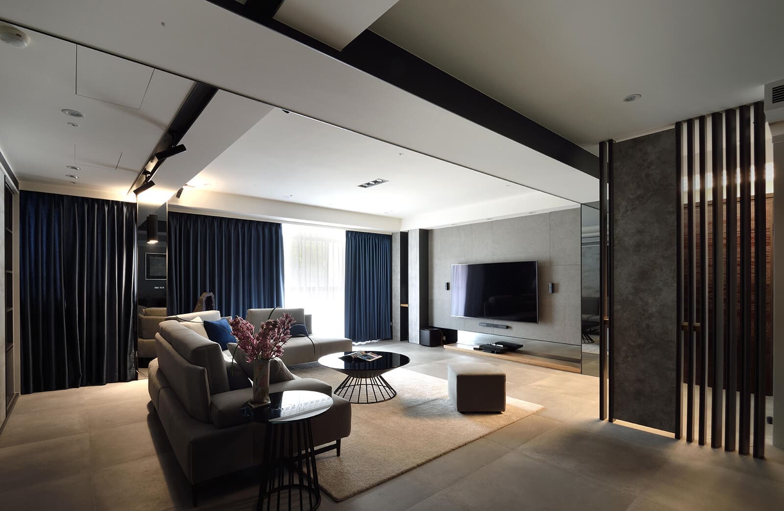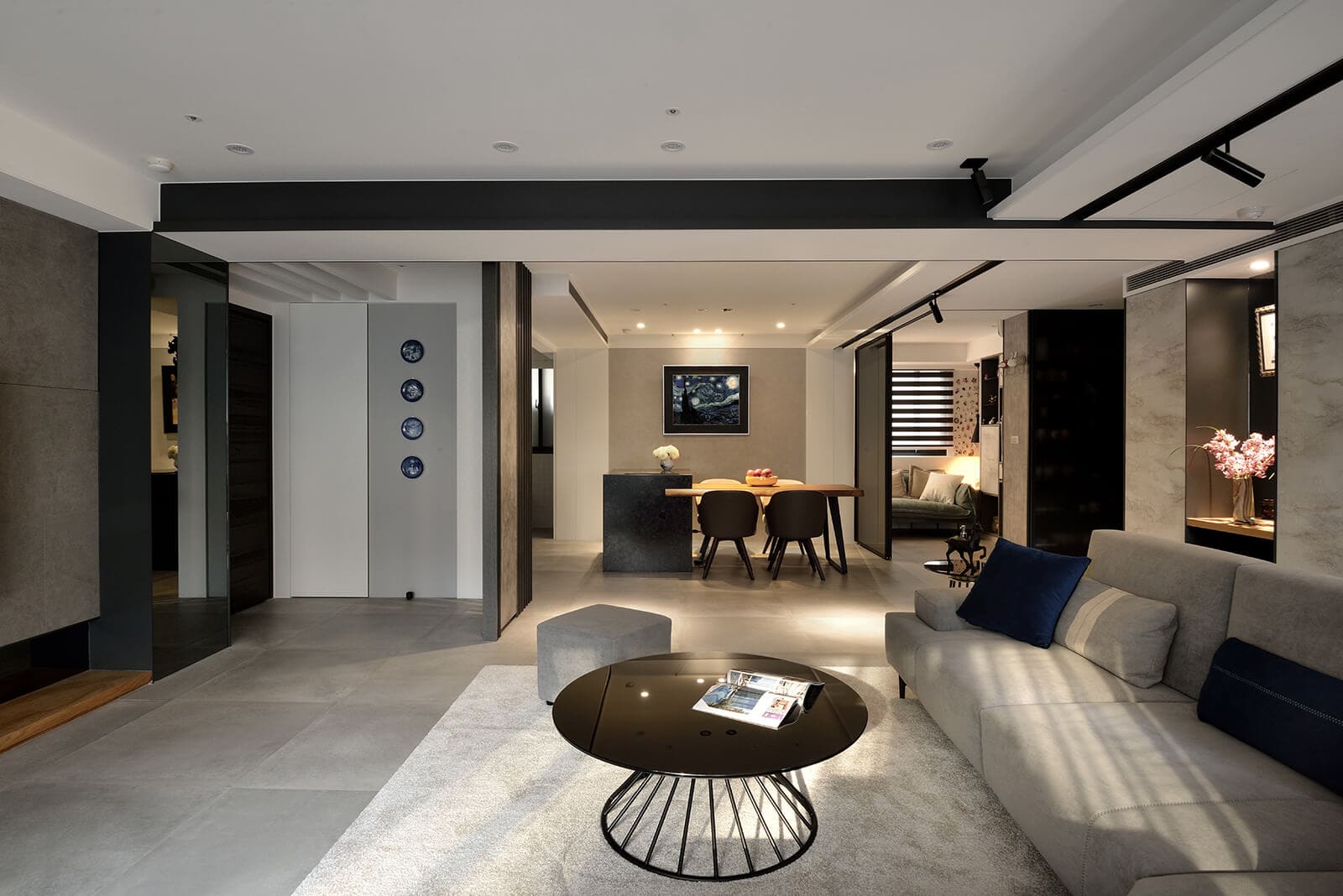 In the living room, gentleman blue cushions and curtains infuse a distinct personality into the space. Behind the sofa, a movable sliding door system can be fully opened or adjusted to the center, left, or right, to create a dynamic visual.