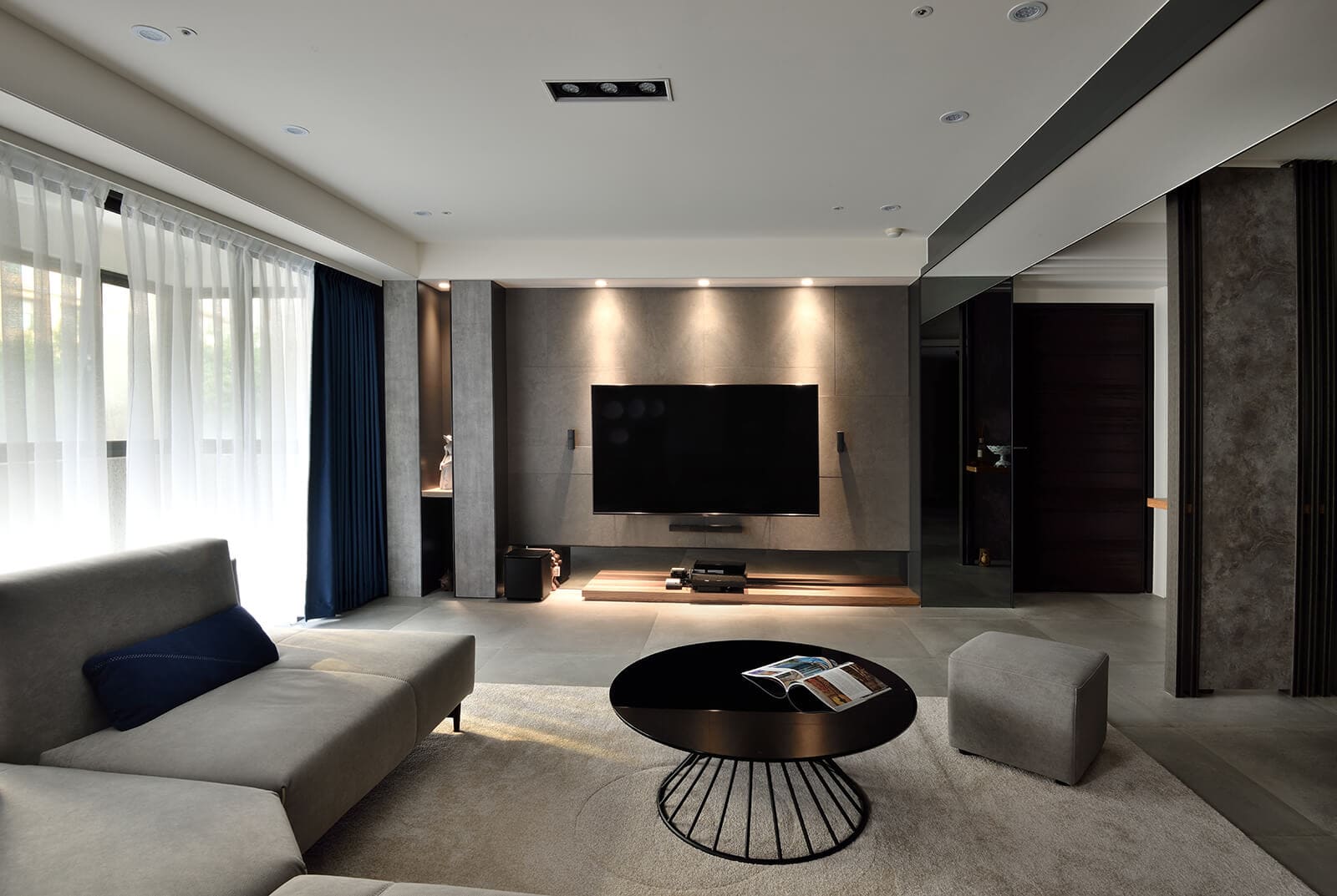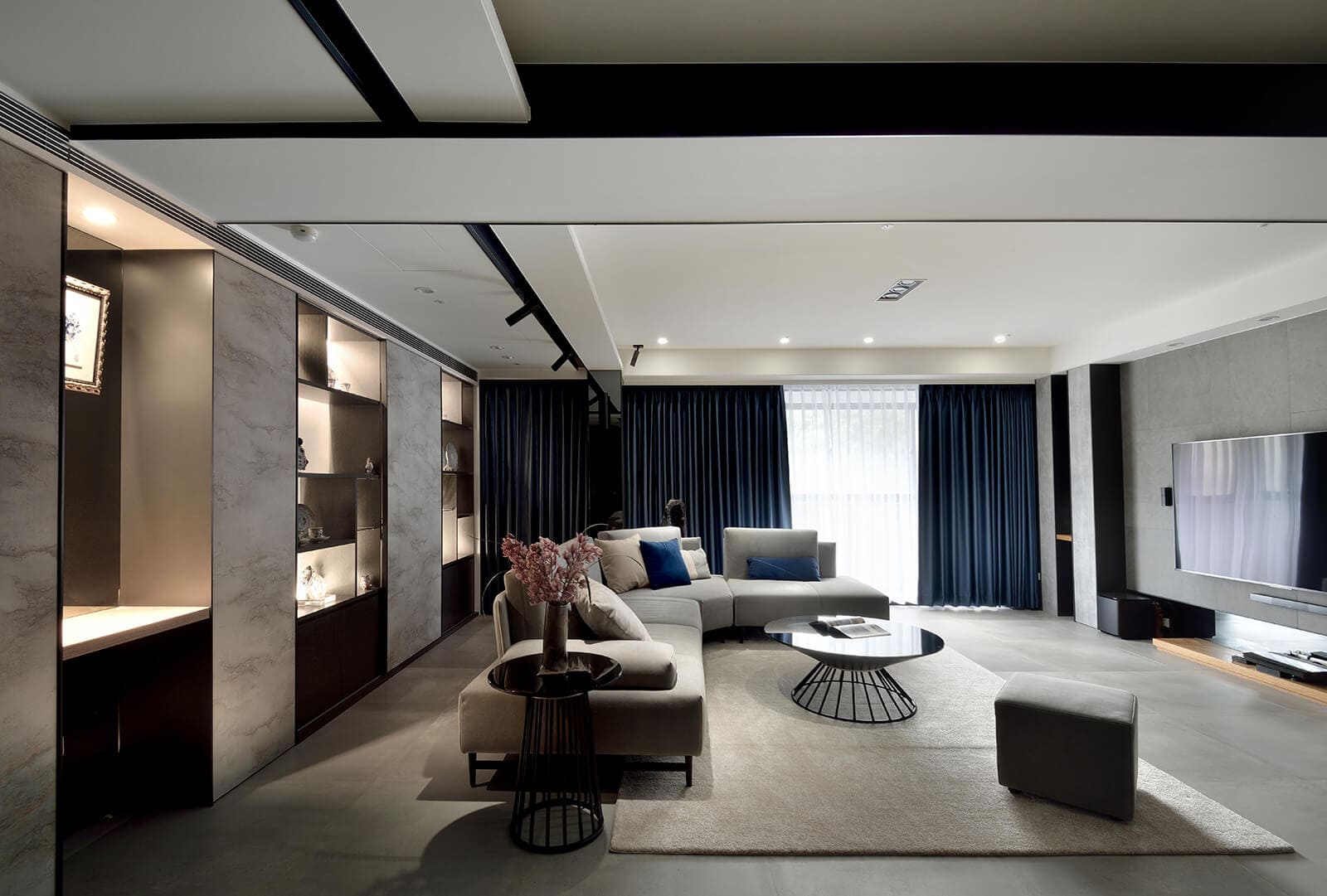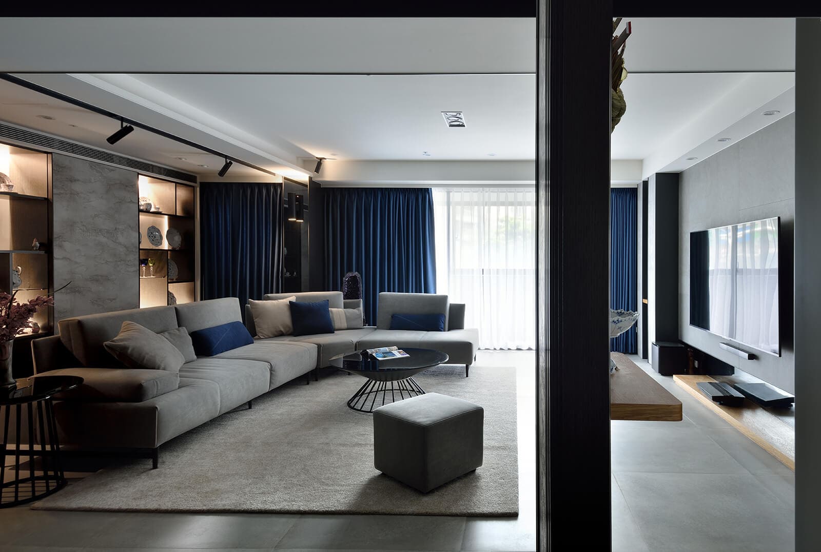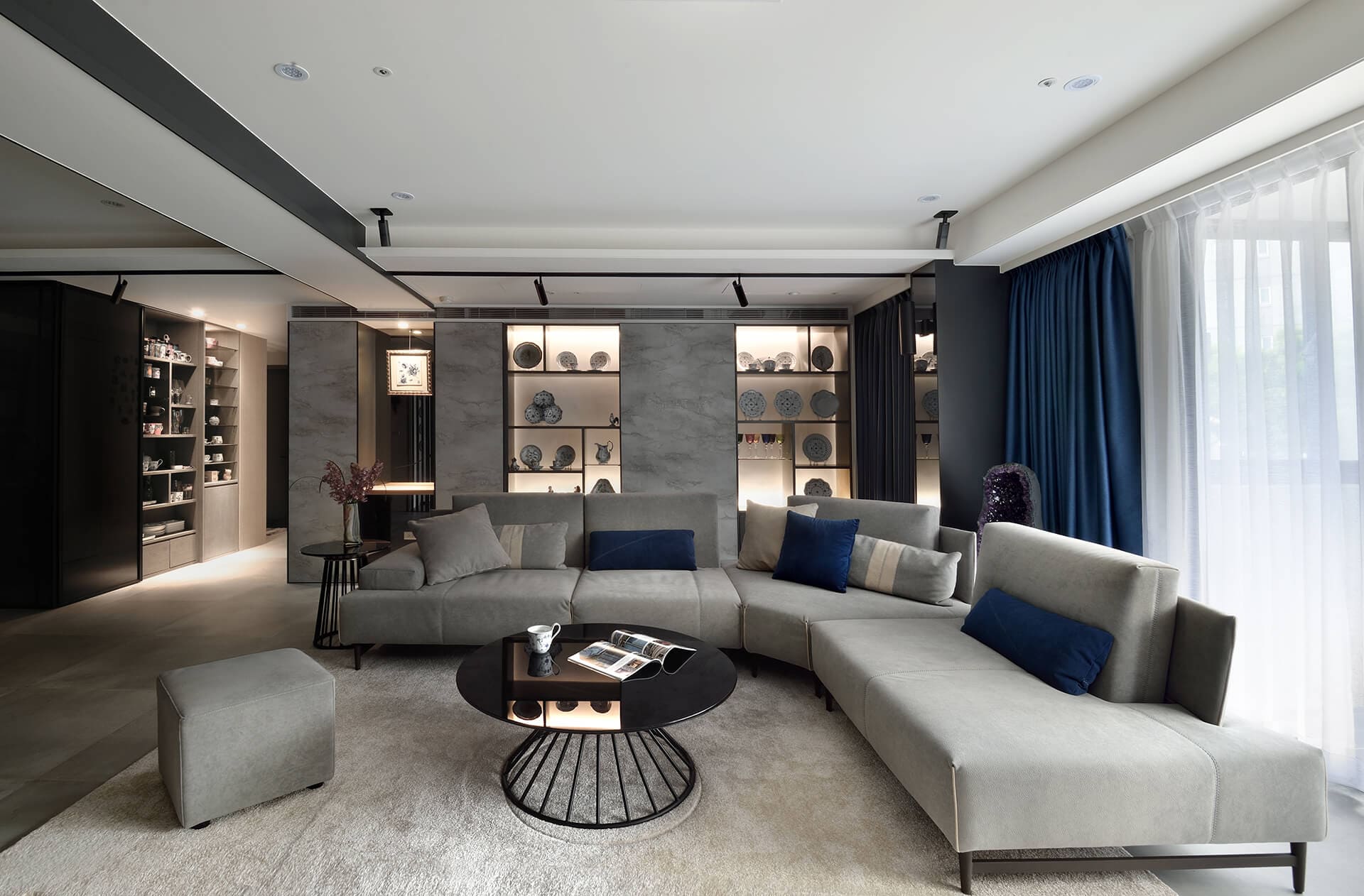 客廳以紳士藍的抱枕與窗簾挹注生活個性,沙發後方設計活動式推拉門扉,可以完全展開,或居中、或左、或右的調整立面陳列關係,構成視覺焦點。