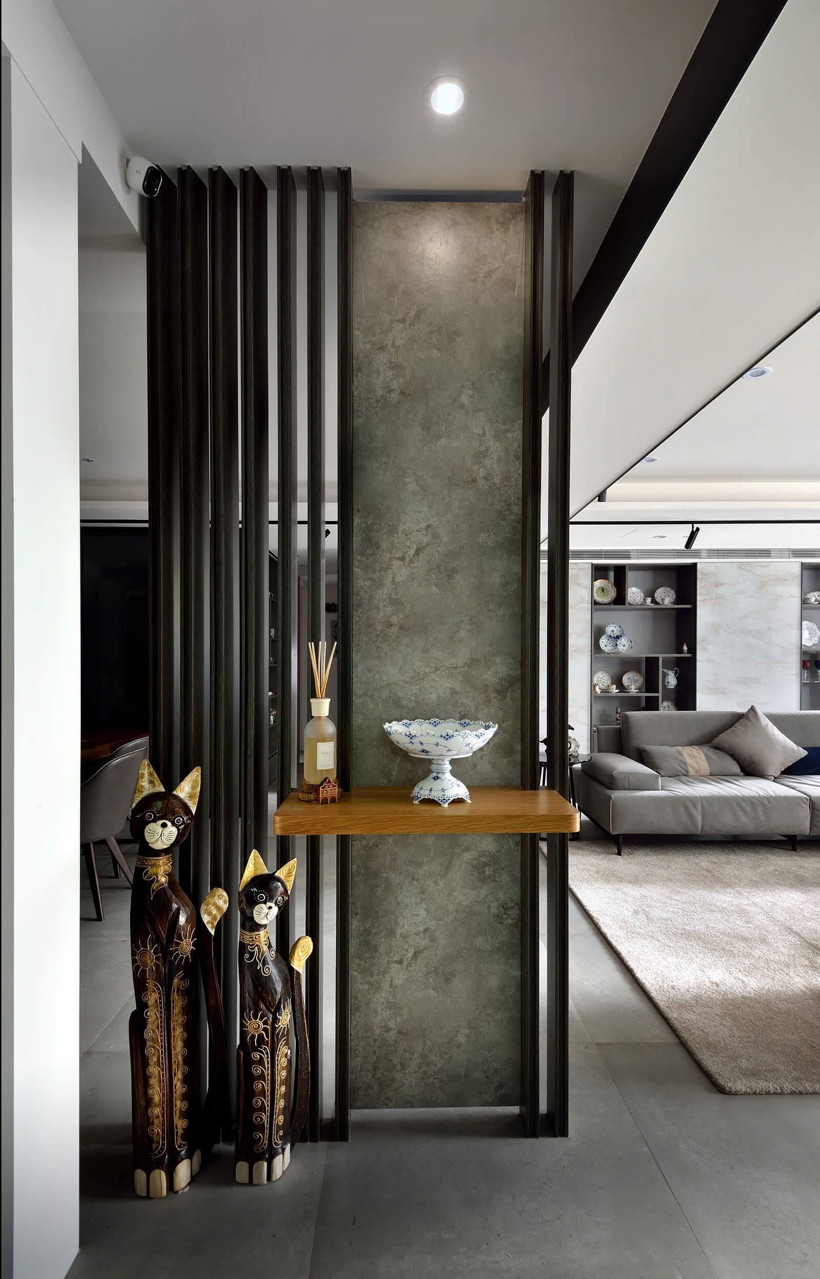 室內規劃上,針對熱衷瓷器收藏的屋主,特別規劃充裕的陳列機能之外,同時放低空間彩度與減化異材質搭接,以創造視覺與空間的延展性、平衡實質空間需求與空間本質的堅持。