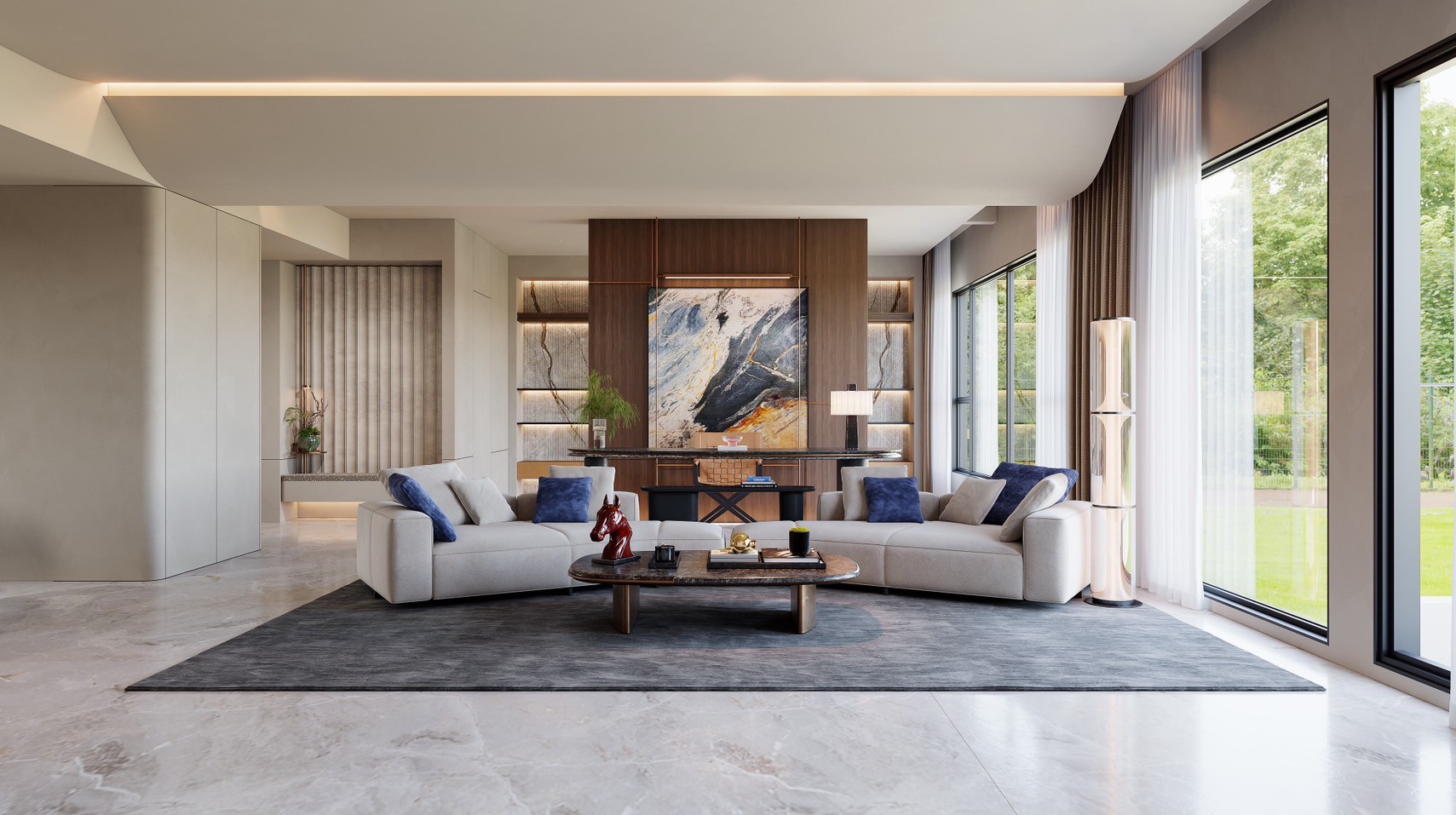 設計團隊善用原有的大面落地窗優勢,將戶外自然光引入室內,內外之間的界線也因此被柔化,透過此設計思維,使住宅中的每一道牆面,包括電視牆,都不再受限於傳統框架,而被完美融入到了整體景觀之中。