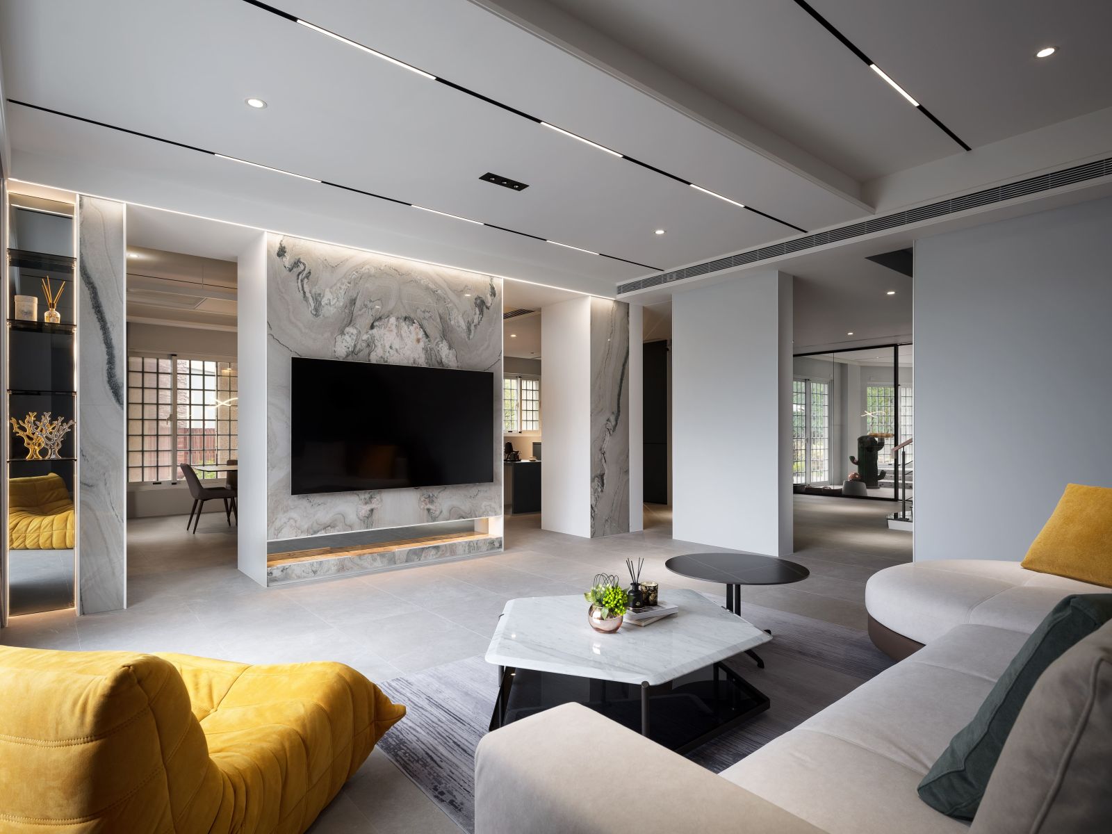 大面落地陽光,沁染一室優雅。公領域的回字設計概念,串起臥房、衛浴、起居與更衣空間,讓寵物與主人的互動更加流暢。